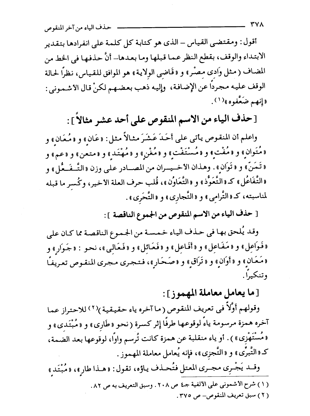 وقولهم أَوَّلًا في تعريف المنقوص (ما آخره ياء حقيقية) (2) للاحتراز عما آخره همزة مرسومة ياءً لوقوعها طرفًا إِثر كسرة (نحو "طَارِى" و"مُبْتَدِى" و"مُسْتَهْزِى"). أو ياء منقلبة عن همزة كانت تُرسم واوًا، لوقوعها بعد الضمة، كـ"التَّبرِّى" و"التَّجزِى"، فإِنه يُعامل معاملة المهموز.