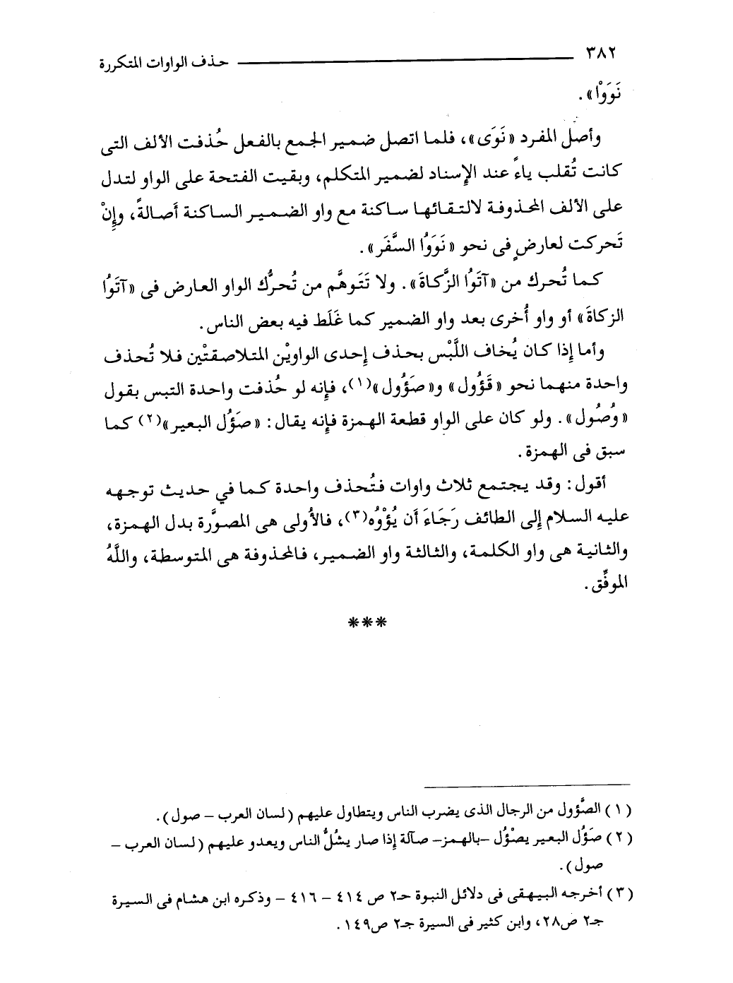 أقول: وقد يجتمع ثلاث واوات فتُحذف واحدة كما في حديث توجهه عليه السلام إِلى الطائف رَجَاءَ أَن يُؤْوُه (3)، فالأُولى هى المصوَّرة بدل الهمزة، والثانية هى واو الكلمة، والثالثة واو الضمير، فالمحذوفة هى المتوسطة، واللهُ الموفِّق.