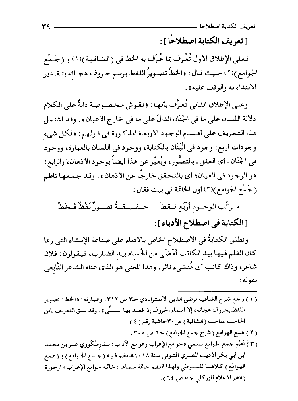 (1) راجع شرح الشافية لرضى الدين الاستراباذي حـ3 ص 312. وعبارته: "الخط: تصوير اللفظ بحروف هجائه، إِلا أسماء الحروف إِذا قصد بها المسمَّى". وقد سبق التعريف بابن الحاجب صاحب (الشافية) ص 30 حاشية رقم (4).