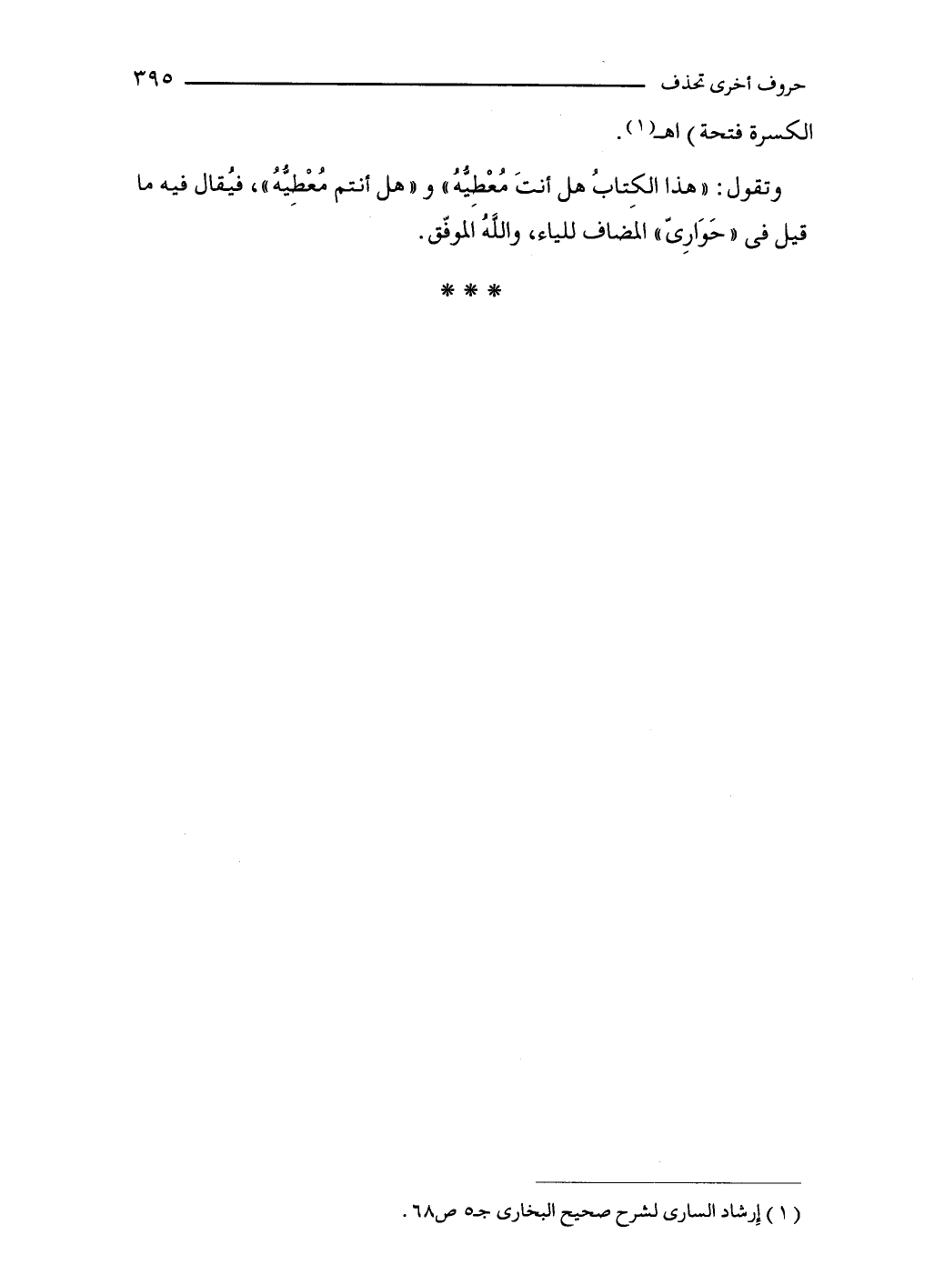 وتقول: "هذا الكِتابُ هل أنتَ مُعْطِيُّهُ" و"هل أنتم مُعْطِيُّهُ"، فيُقال فيه ما قيل في "حَوَارِىّ" المضاف للياء، واللهُ الموفّق.