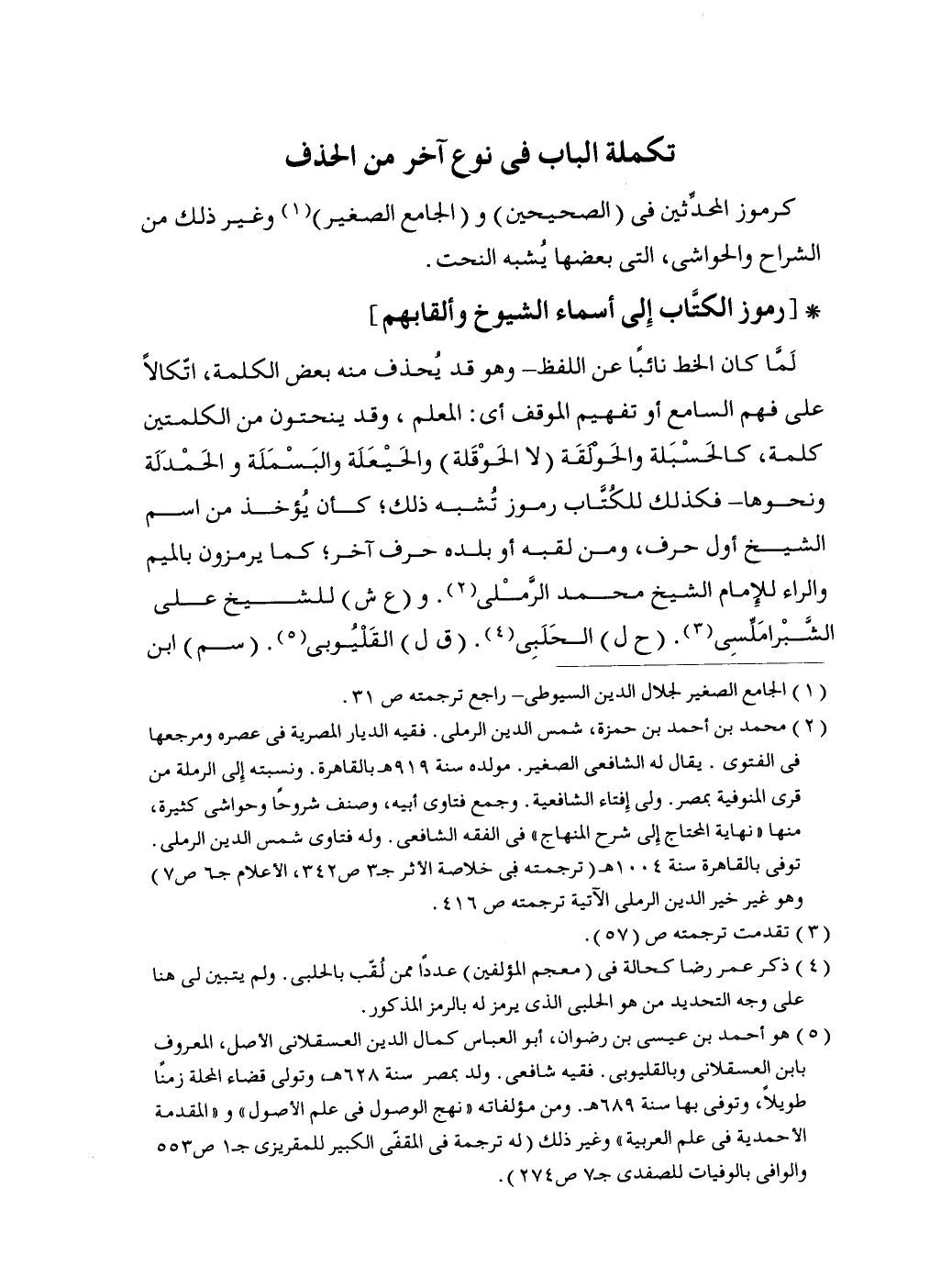 لَمَّا كان الخط نائبًا عن اللفظ -وهو قد يُحذف منه بعض الكلمة، اتّكالًا على فهم السامع أو تفهيم الموقف أي: المعلم، وقد ينحتون من الكلمتين كلمة، كالحَسْبَلة والحَوْلقَة (لا الحَوْقَلة) والحَيْعَلَة والبَسْمَلَة ونحوها- فكذلك للكُتَّاب رموز تُشبه ذلك؛ كأن يُؤخذ من اسم الشيخ أول حرف، ومن لقبه أو بلده حرف آخر؛ كما يرمزون بالميم والراء للإِمام الشيخ محمَّد الرَّمْلى (2). و (ع ش) للشيخ على الشمَّبْرامَلِّسِى (3). (ح ل) الحَلَبِى (4). (ق ل) القَلْيُوبى (5). (سم) ابن