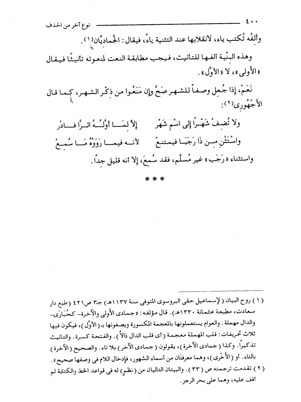 (1) روح البيان (لإِسماعيل حقى البروسوى المتوفى سنة 1137هـ) جـ3 ص 421 (طبع دار سعادت، مطبعة عثمانة 1330 هـ). قال مؤلفه: "جمادى الأُولى والآخرة -كحُبَارَى- والدال مهملة. والعوام يستعملونها بالمعجمة المكسورة ويصفونها بـ (الأَوَّل)، فيكون فيها ثلاث تحريفات: قلب المهملة معجمة (أي قلب الدال ذالًا). والفتحة كسرة. والتأنيث تذكيرًا. وكذا (جمادى الآخرة)، يقولون (جمادى الآخر) بلا تاء. والصحيح (الآخرة) بالتاء. أو (الأُخْرى)، وهما معرفتَان من أسماء الشهور، فإِدخال اللام في وصفها صحيح".