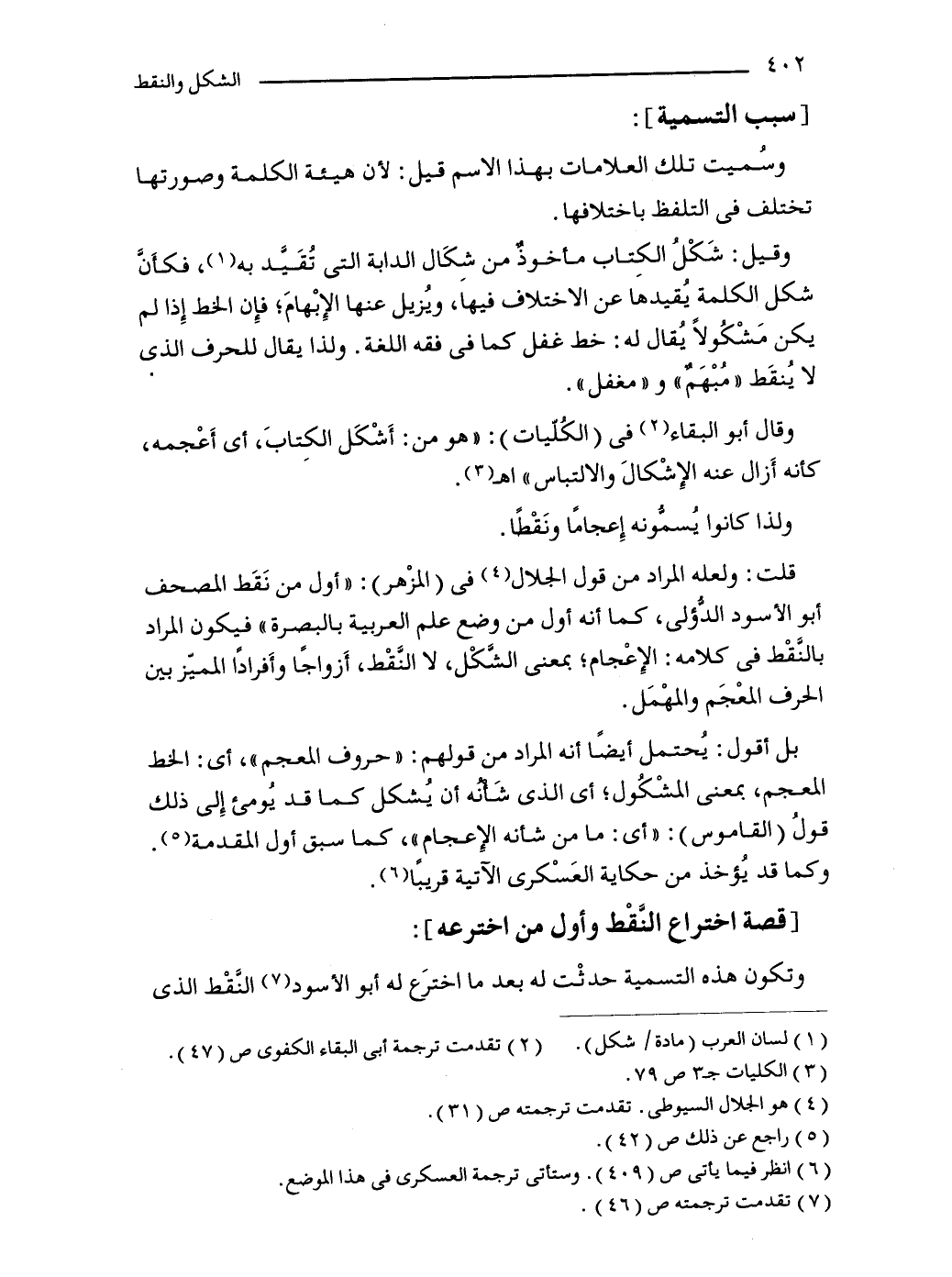 قلت: ولعله المراد من قول الجلال (4) في (المزْهر): "أول من نَقَط المصحف أبو الأسود الدُّؤلى، كما أنه أول من وضع علم العربية بالبصرة" فيكون المراد بالنَّقْط في كلامه: الإِعْجام؛ بمعنى الشَّكْل، لا النَّقْط، أَزواجًا وأَفرادًا المميّز بين الحرف المعْجَم والمهْمَل.