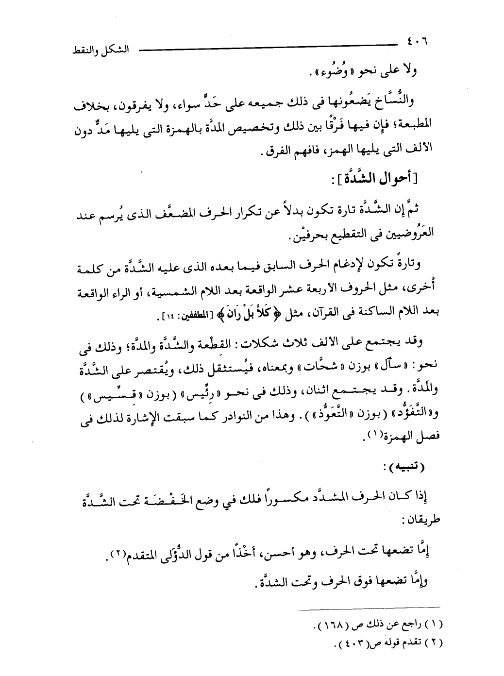 ثمَّ إِن الشَّدَّة تارة تكون بدلًا عن تكرار الحرف المضعَّف الذي يُرسم عند العَرُوضيين في التقطيع بحرفيْن.