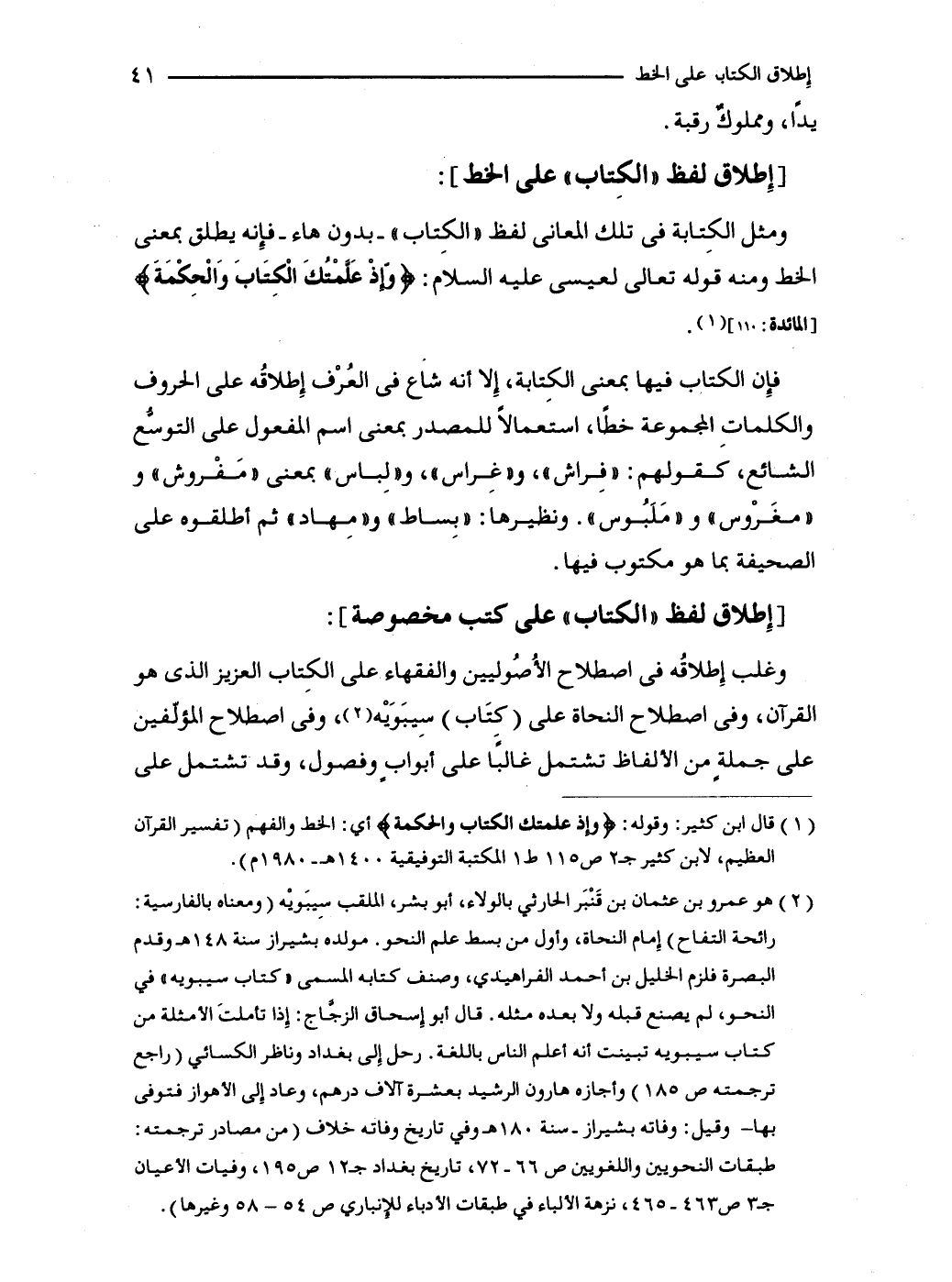 وغلب إِطلاقُه في اصطلاح الأُصُوليين والفقهاء على الكِتاب العزيز الذى هو القرآن، وفي اصطلاح النحاة على (كِتَاب) سِيبَوَيْه (2)، وفي اصطلاح المؤلّفين على جملةٍ من الألفاظ تشتمل غالبًا على أبوابٍ وفصول، وقد تشتمل على