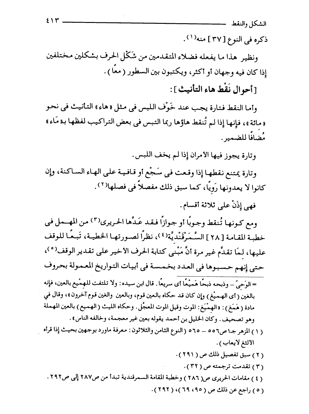وأما النقط فتارة يجب عند خَوْف اللبس في مثل "هاء" التأنيث في نحو "مِائة"، فإِنها إذا لم تُنقط هاؤها ربما التبس في بعض التراكيب لفظها بـ"مَاء" مُضافًا للضمير.