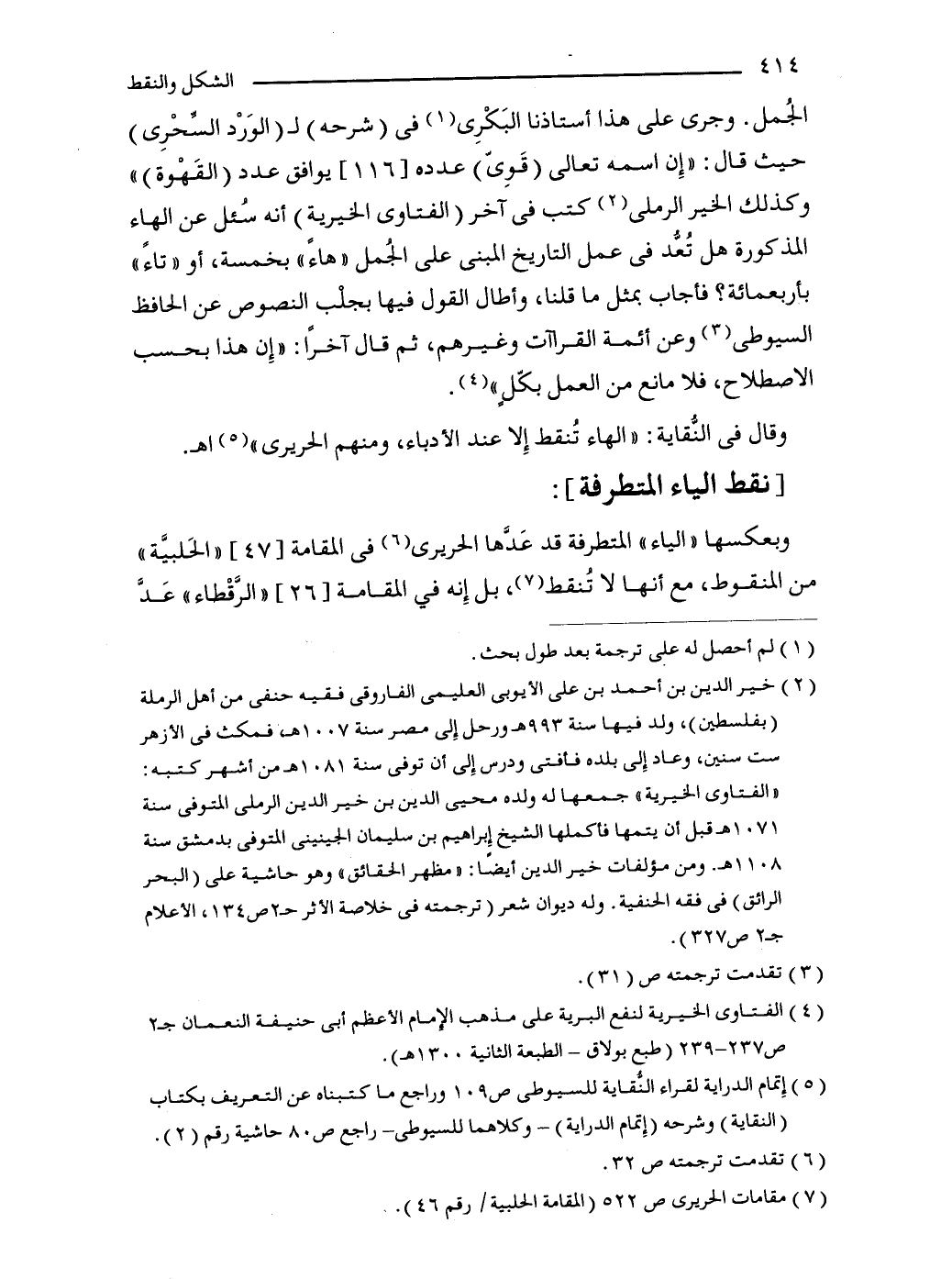 وقال في النُّقاية: "الهاء تُنقط إِلا عند الأدباء، ومنهم الحريرى" (5) اهـ.