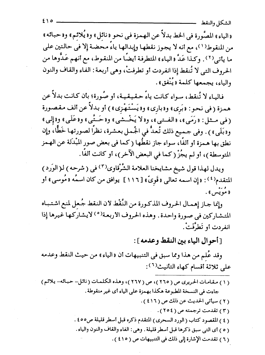 وقد عُلِم من هذا ومما سبق في التنبيهات أن "الياء" عن حيث النقط وعدمه على ثلاثة أقسام كهاء التأنيث (6):