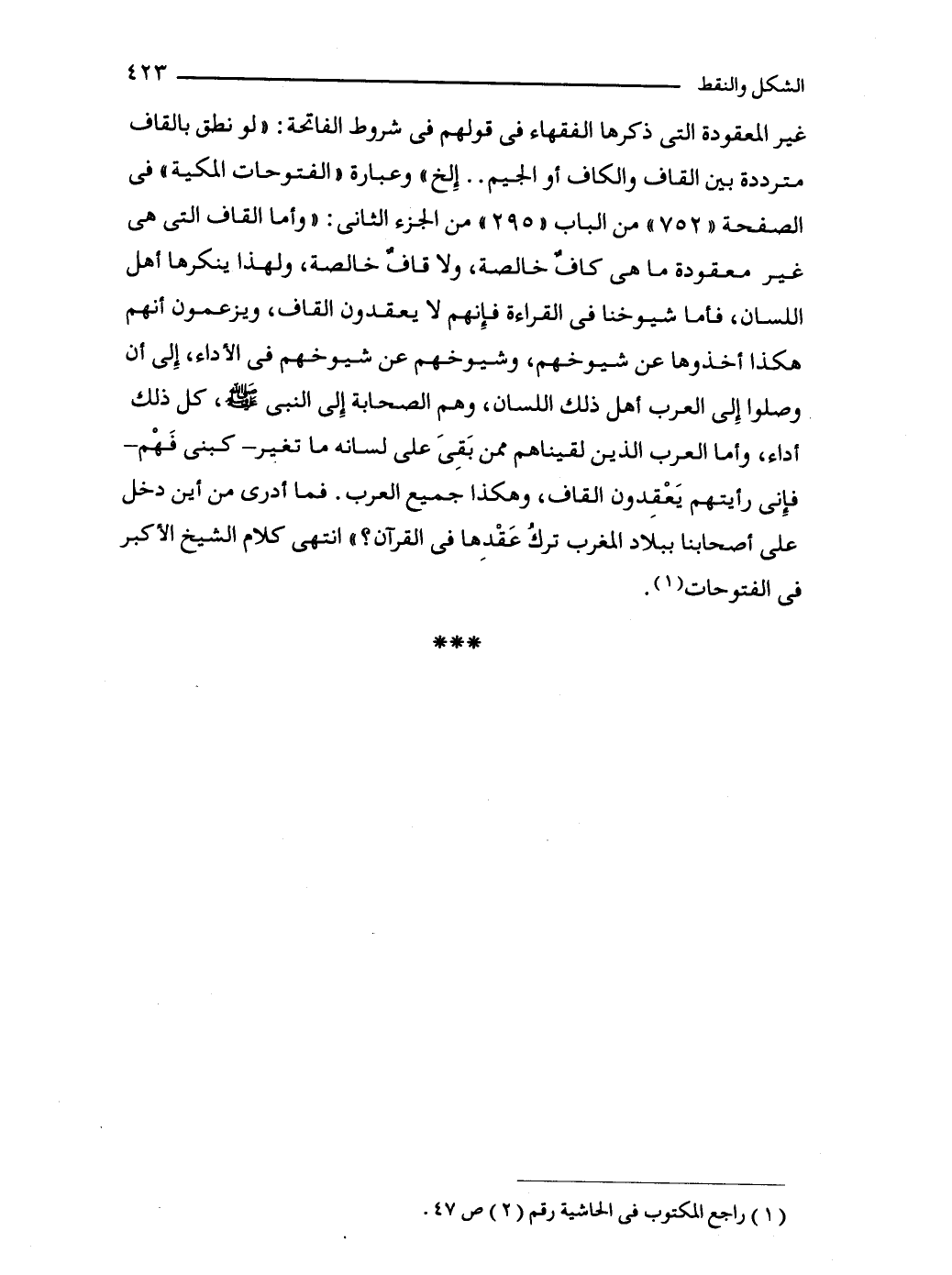 غير المعقودة التي ذكرها الفقهاء في قولهم في شروط الفاتحة: "لو نطق بالقاف مترددة بين القاف والكاف أو الجيم .. إِلخ" وعبارة "الفتوحات المكية" في الصفحة "752" من الباب "295" من الجزء الثاني: "وأما القاف التي هى غير معقودة ما هى كافٌ خالصة، ولا قافٌ خالصة، ولهذا ينكرها أهل اللسان، فأما شيوخنا في القراءة فإِنهم لا يعقدون القاف، ويزعمون أنهم هكذا أخذوها عن شيوخهم، وشيوخهم عن شيوخهم في الأداء، إِلى أن وصلوا إِلى العرب أهل ذلك اللسان، وهم الصحابة إِلى النبي - صلى الله عليه وسلم -، كل ذلك أداء، وأما العرب الذين لقيناهم ممن بَقِىَ على لسانه ما تغير -كبنى فَهْم- فإِنى رأيتهم يَعْقِدون القاف، وهكذا جميع العرب. فما أدرى من أين دخل على أصحابنا ببلاد المغرب تركُ عَقْدِها في القرآن؟ " انتهى كلام الشيخ الأكبر في الفتوحات (1).