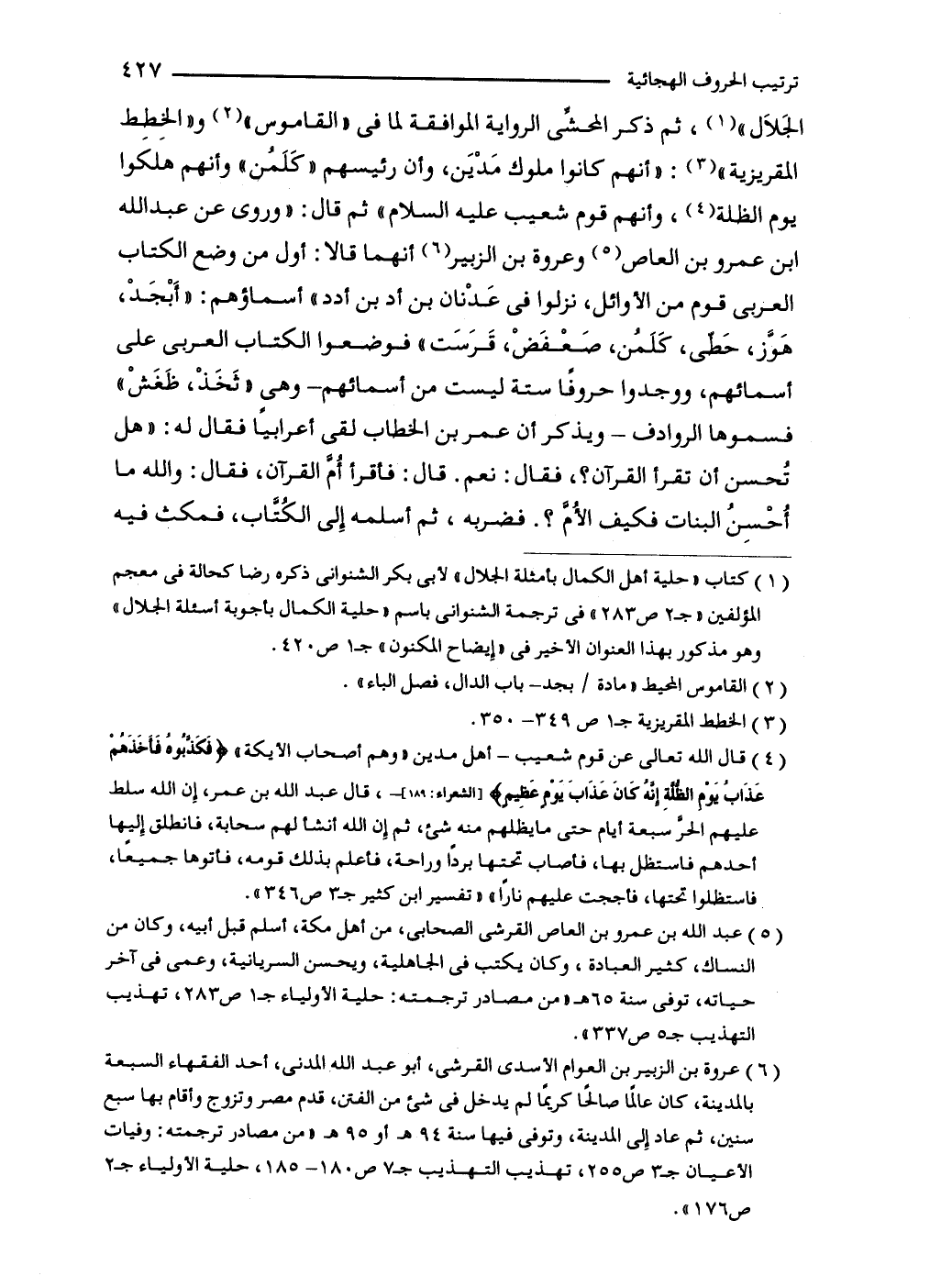 الجَلَال" (1)، ثم ذكر المحشِّى الرواية الموافقة لما في "القاموس" (2) و"الخطط المقريزية" (3): "أنهم كانوا ملوك مَدْيَن، وأن رئيسهم "كَلَمُن" وأنهم هَلكَوا يوم الظلة (4)، وأنهم قوم شعيب عليه السلام" ثم قال: "وروى عن عبد الله ابن عمرو بن العاص (5) وعروة بن الزبير (6) أنهما قالا: أول من وضع الكتاب العربى قوم من الأوائل، نزلوا في عَدْنان بن أد بن أدد" أسماؤهم: "أَبْجَدْ، هَوَّز، حَطّى، كَلَمُن، صَعْفَضْ، قَرَسَت" فوضعوا الكتاب العربى على أسمائهم، ووجدوا حروفًا ستة ليست من أسمائهم -وهي "ثَخَذْ، ظَغَشْ" فسموها الروادف- ويذكر أن عمر بن الخطاب لقى أعرابيًا فقال له: "هل تُحسن أن تقرأ القرآن؟، فقال: نعم. قال: فاقرأ أُمَّ القرآن، فقال: والله ما أُحْسِنُ البنات فكيف الأُمَّ؟. فضربه، ثم أسلمه إِلى الكُتَّاب، فمكث فيه