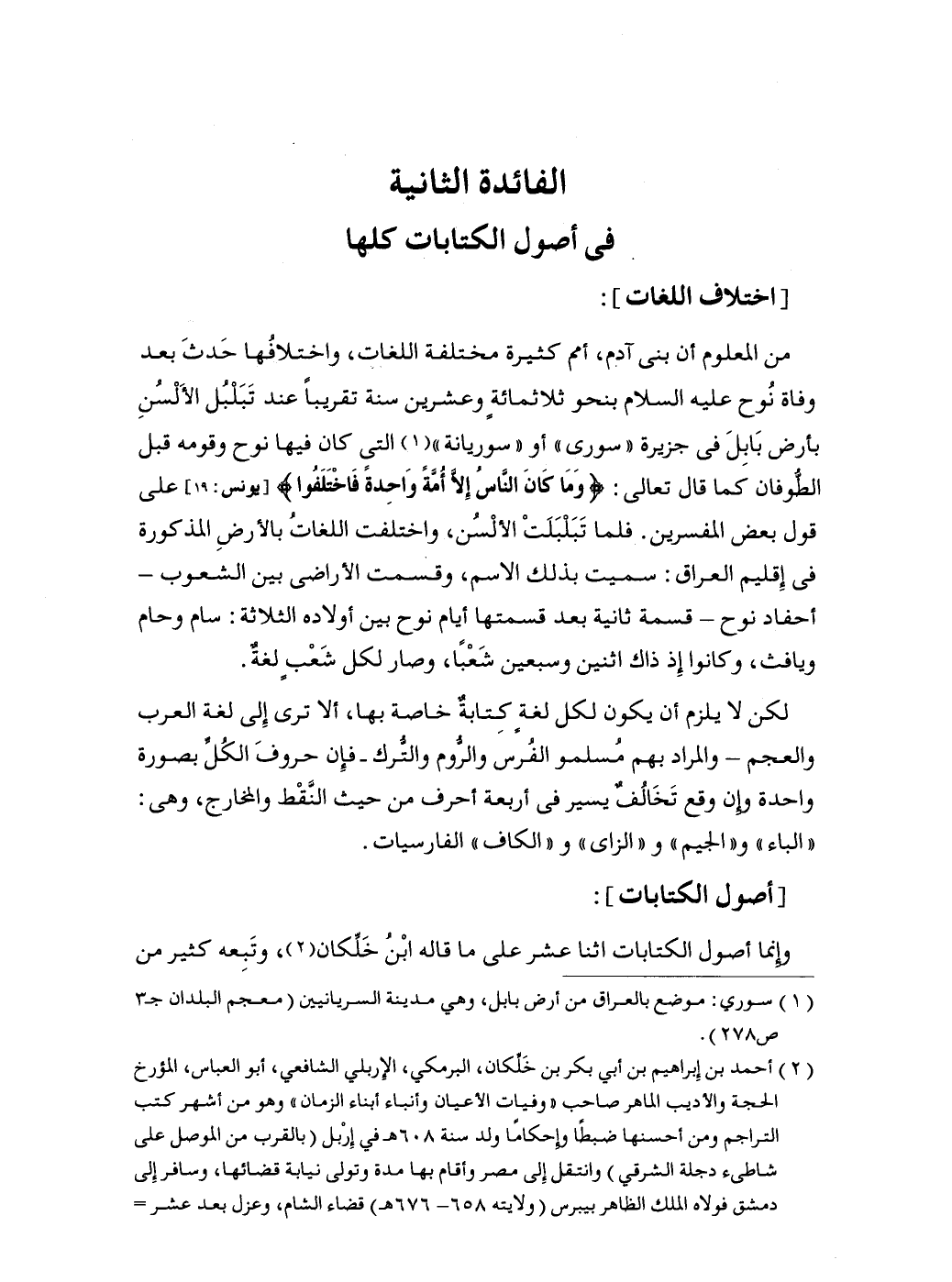 (2) أحمد بن إبراهيم بن أبي بكر بن خَلِّكان، البرمكي، الإِربلي الشافعي، أبو العباس، المؤرخ الحجة والأديب الماهر صاحب "وفيات الأعيان وأنباء أبناء الزمان" وهو من أشهر كتب التراجم ومن أحسنها ضبطًا وإحكامًا ولد سنة 608 هـ في إِرْبل (بالقرب من الموصل على شاطئ دجلة الشرقي) وانتقل إِلى مصر وأقام بها مدة وتولى نيابة قضائها، وسافر إِلى دمشق فولاه الملك الظاهر بيبرس (ولايته 658 - 676 هـ) قضاء الشام، وعزل بعد عشر =