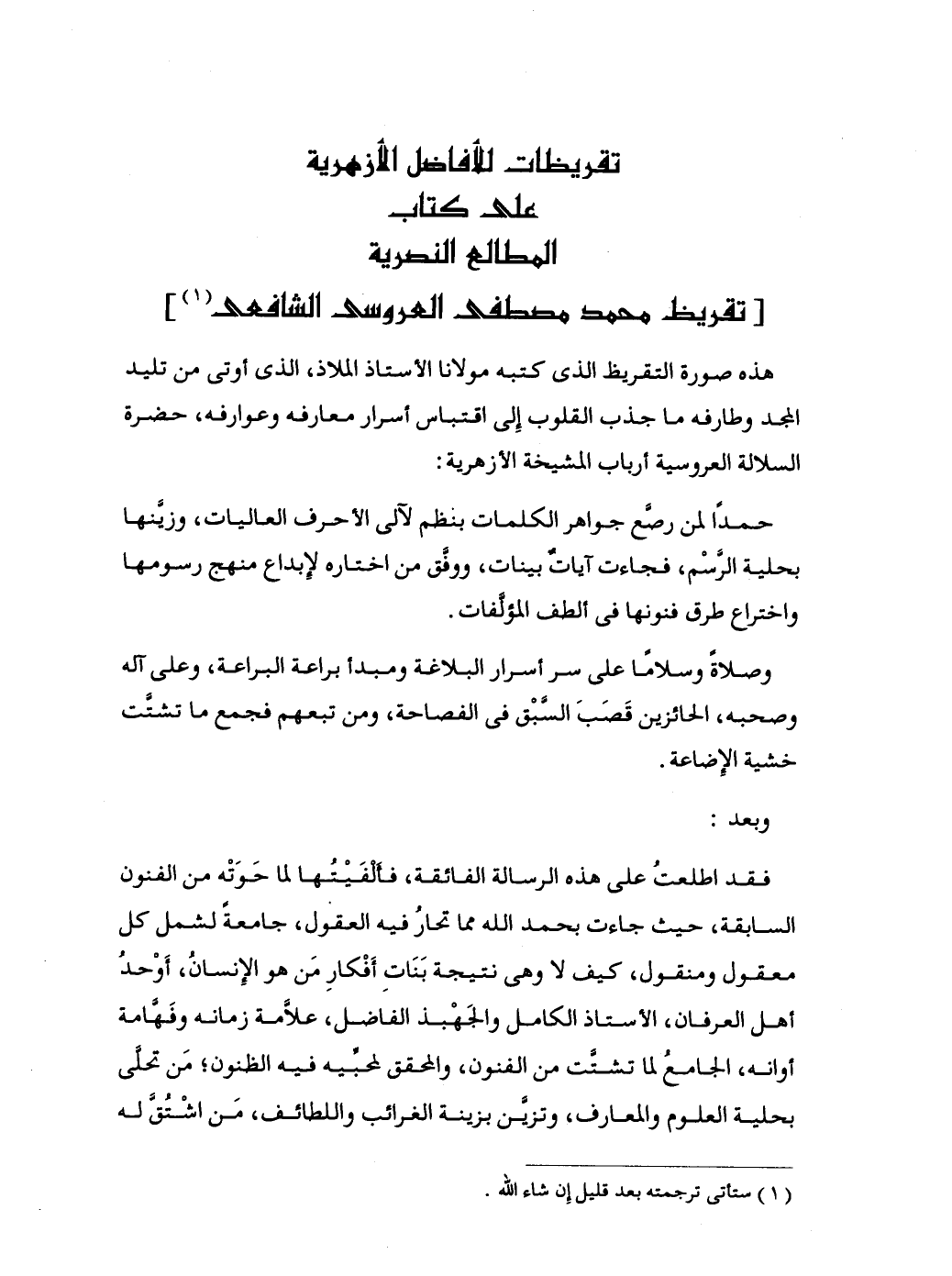 تقريظات للأفاضل الأزهرية على كتاب المطالع النصرية [تقريظ محمَّد مصطفى العروسى الشافعى (1)]