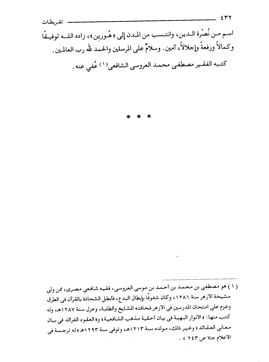 (1) هو مصطفى بن محمَّد بن أحمد بن موسى العروسى، فقيه شافعى مصرى، ممن ولى مشيخة الأزهر سنة 1281، وكان شغوفًا بإِبطال البدع، فأبطل الشحاذة بالقرآن في الطرق وعزم على امتحان المدرسين في الأزهر فخافته المشايخ والطلبة، وعزل سنة 1287 هـ وله كتب منها: "الأنوار البهية في بيان أحقية مذهب الشافعية" و"العقود الفرائد في بيان معانى العقائد" وغير ذلك، مولده سنة 1213 هـ، وتوفى سنة 1293 هـ "له ترجمة في الأعلام جـ7 ص 243".