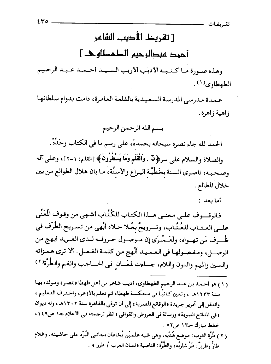 وهذه صورة ما كتبه الأديب الأريب السيد أحمد عبد الرحيم الطهطاوى (1).