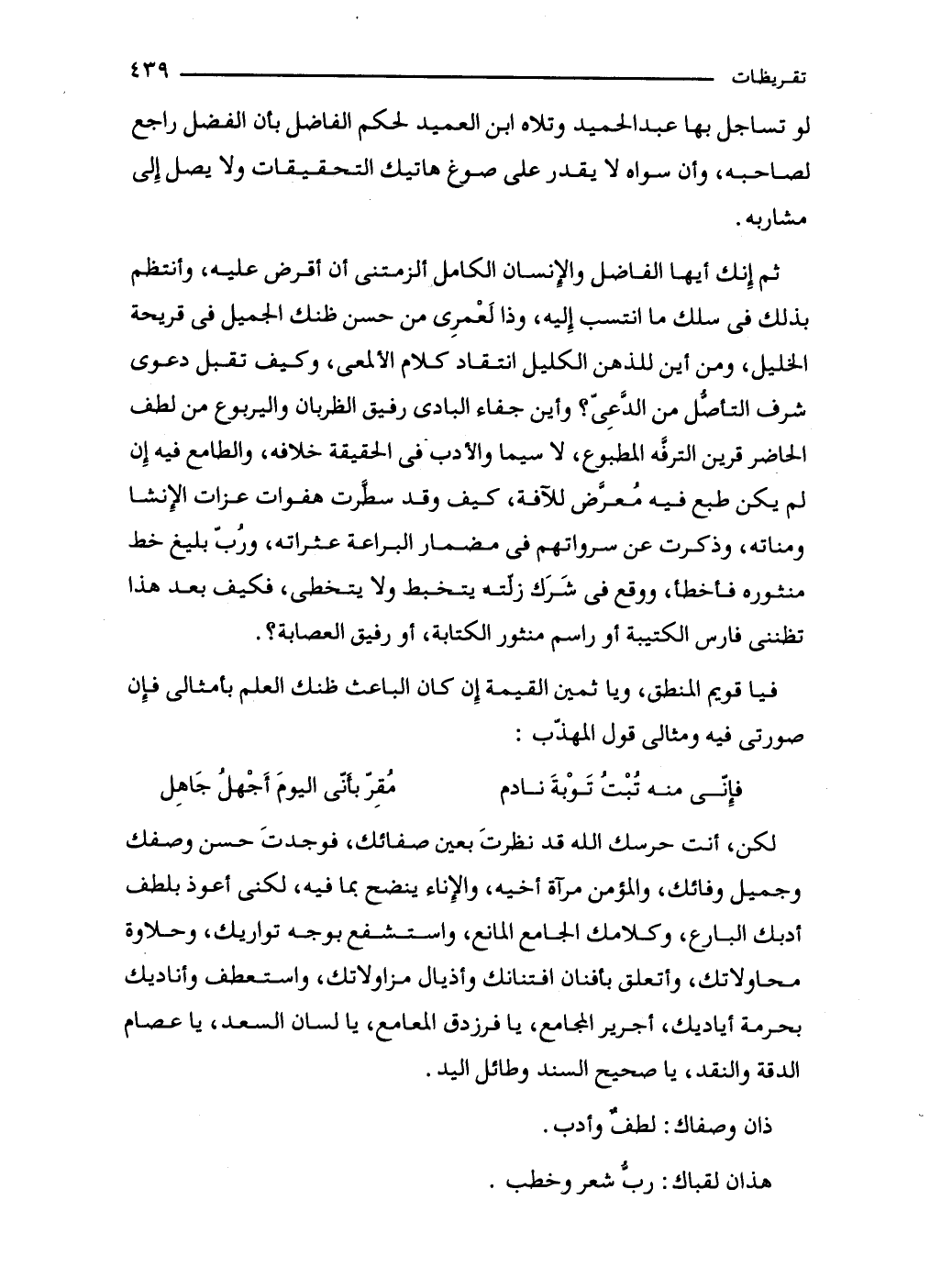 لكن، أنت حرسك الله قد نظرتَ بعين صفائك، فوجدتَ حسن وصفك وجميل وفائك، والمؤمن مرآة أخيه، والإِناء ينضح بما فيه، لكنى أعوذ بلطف أدبك البارع، وكلامك الجامع المانع، واستشفع بوجه تواريك، وحلاوة محاولاتك، وأتعلق بأفنان افتنانك وأذيال مزاولاتك، واستعطف وأناديك بحرمة أياديك، أجرير المجامع، يا فرزدق المعامع، يا لسان السعد، يا عصام الدقة والنقد، يا صحيح السند وطائل اليد.