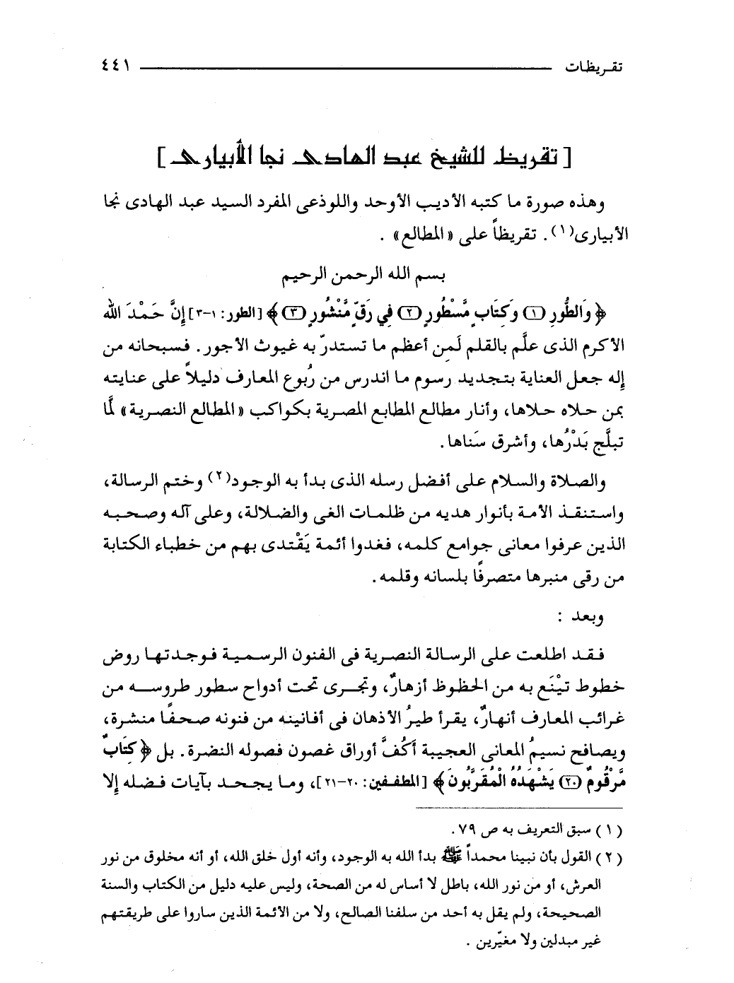 {وَالطُّورِ (1) وَكِتَابٍ مَسْطُورٍ (2) فِي رَقٍّ مَنْشُورٍ (3)} [الطور: 1 - 3] إِنَّ حَمْدَ الله الأكرم الذي علَّم بالقلم لَمِن أعظم ما تستدرّ به غيوث الأجور. فسبحانه من إِله جعل العناية بتجديد رسوم ما اندرس من رُبوع المعارف دليلًا على عنايته بمن حلاه حلاها، وأنار مطالع المطابع المصرية بكواكب "المطالع النصرية" لمَّا تبلَّج بَدْرُها، وأشرق سَناها.