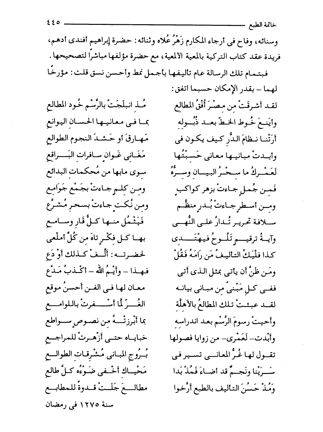 وسنائه، وفاح في أرجاء المكارم زَهْرُ عُلاه وثنائه: حضرة إِبراهيم أفندي أدهم، فريدة عقد كتاب التركية بالمعية الألمعية، مع حضرة مؤلفها مباشرًا لتصحيحها.