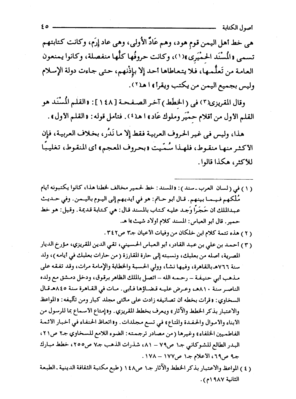 وقال المقريزى (3) في (الخِطَط) آخر الصفحة [148]: "القلم المُسْنَد هو القلم الأول من أقلام حِمْيَر وملوك عَاد" اهـ (4). فتأمل قوله: "القلم الأول".