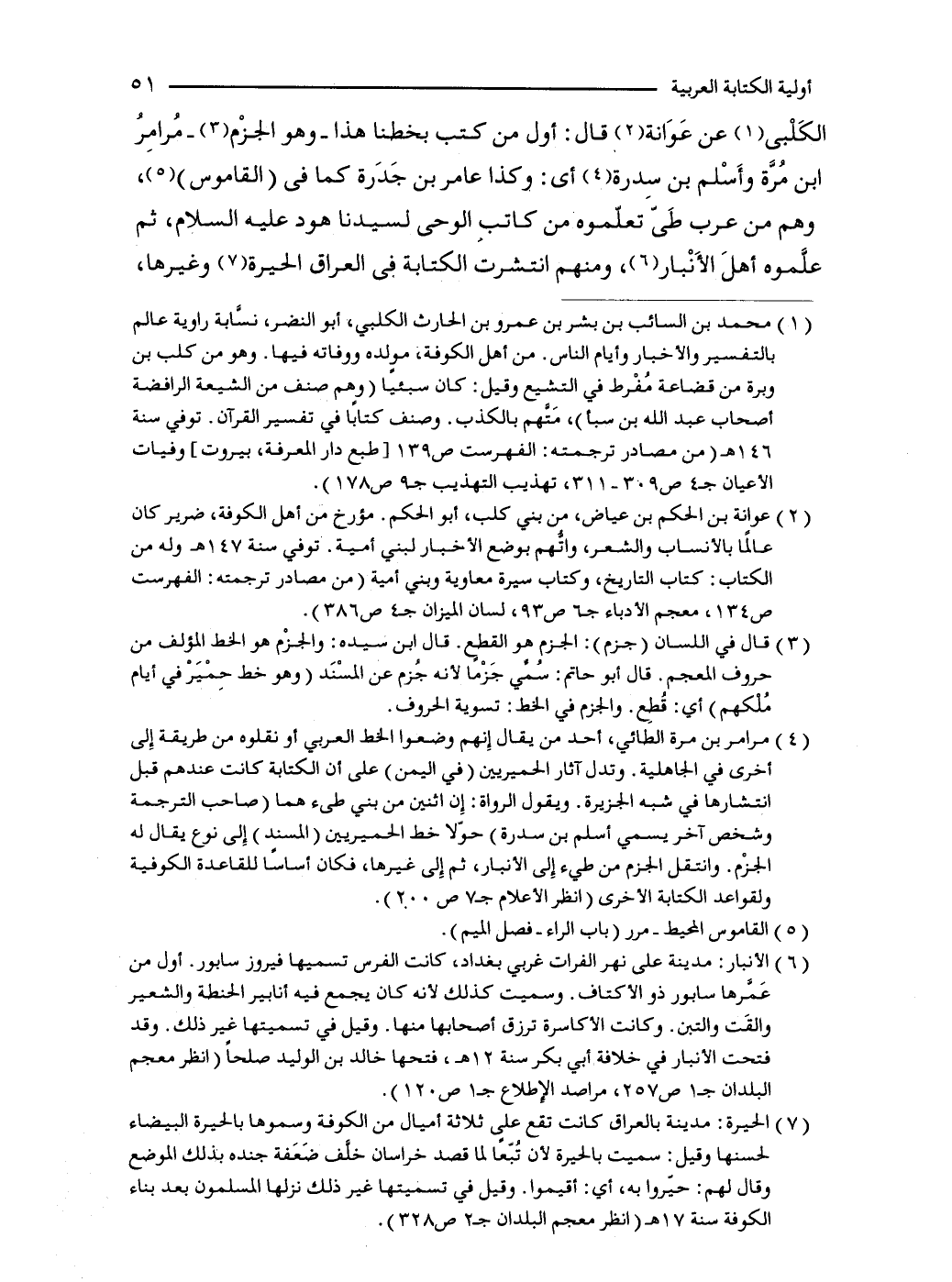 الكَلْبى (1) عن عَوَانة (2) قال: أول من كتب بخطنا هذا -وهو الجزْم (3) - مُرامِرُ ابن مُرَّة وأَسْلم بن سِدرة (4) أي: وكذا عامر بن جَدَرة كما في (القاموس) (5)، وهم من عرب طَىّ تعلموه من كاتب الوحى لسيدنا هود عليه السلام، ثم علَّموه أهلَ الأَنْبار (6)، ومنهم انتشرت الكتابة في العراق الحيرة (7) وغيرها،