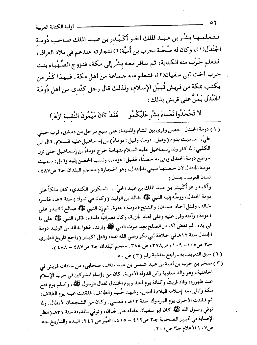 فتعلمها بِشر بن عبد الملك أخو أُكَيْدِر بن عبد الملك صاحب دُومَةِ الجَنْدَل (1)، وكان له صُحْبة بحرب بن أُميَّة (2) لتجارته عندهم في بلاد العراق، فتعلم حَرْب منه الكتابة، ثم سافر معه بِشْر إِلى مكة، فتزوج الصَّهْباء بنت حرب أخت أبى سفيان (3)، فتعلم منه جماعة من أهل مكة. فبهذا كَثُر من يكتب بمكة من قريش قُبيْل الإِسلام، ولذلك قال رجل كِنْدِى من أهل دُومَة الجَنْدَل يَمُنُّ على قريش بذلك: