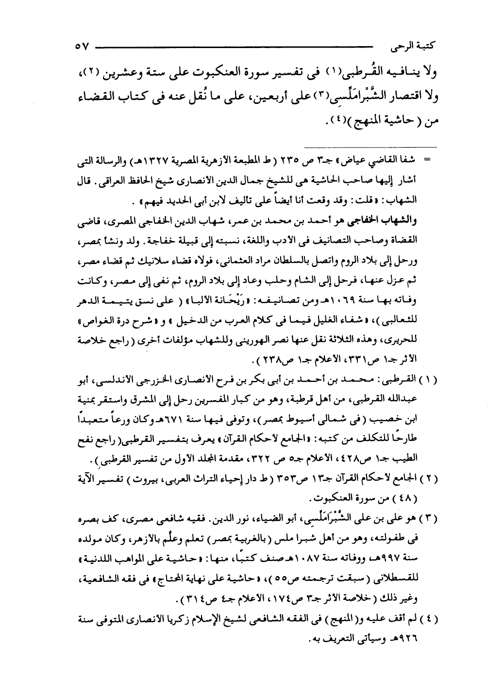 = شفا القاضي عياض" جـ3 ص 235 (ط المطبعة الأزهرية المصرية 1327 هـ) والرسالة التي أشار إِليها صاحب الحاشية هى للشيخ جمال الدين الأنصارى شيخ الحافظ العراقى. قال الشهاب: "قلت: وقد وقعت أنا أيضًا على تأليف لابن أبي الحديد فيهم".