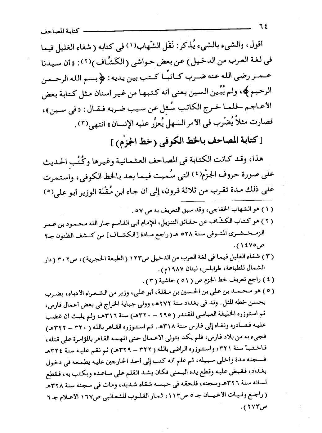 هذا، وقد كانت الكتابة في المصاحف العثمانية وغيرها وكُتُبِ الحديث على صورة حروف الجزْم (4) التي سُميت فيما بعد بالخط الكوفى، واستمرت على ذلك مدة تقرب من ثلاثة قرون، إِلى أن جاء ابن مُقْلة الوزير أبو على (5)