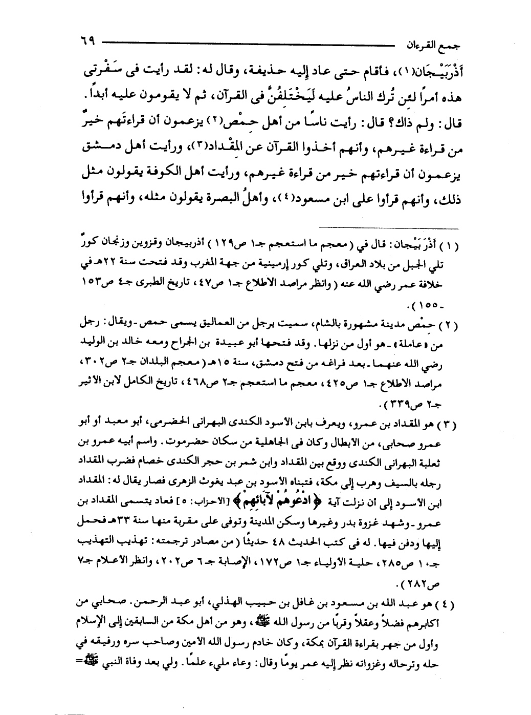 أَذْرَبَيْجَان (1)، فأقام حتى عاد إِليه حذيفة، وقال له: لقد رأيت في سَفْرتى هذه أمرًا لئِن تُرك الناسُ عليه ليَخْتَلِفُنَّ في القرآن، ثم لا يقومون عليه أبدًا. قال: ولم ذاك؟ قال: رأيت ناسًا من أهل حِمْص (2) يزعمون أن قراءتَهم خيرٌ من قراءة غيرهم، وأنهم أخذوا القرآن عن المِقْداد (3)، ورأيت أهل دمشق يزعمون أن قراءتهم خير من قراءة غيرهم، ورأيت أهل الكوفة يقولون مثل ذلك، وأنهم قرأوا على ابن مسعود (4)، وأهلُ البصرة يقولون مثله، وأنهم قرأوا
