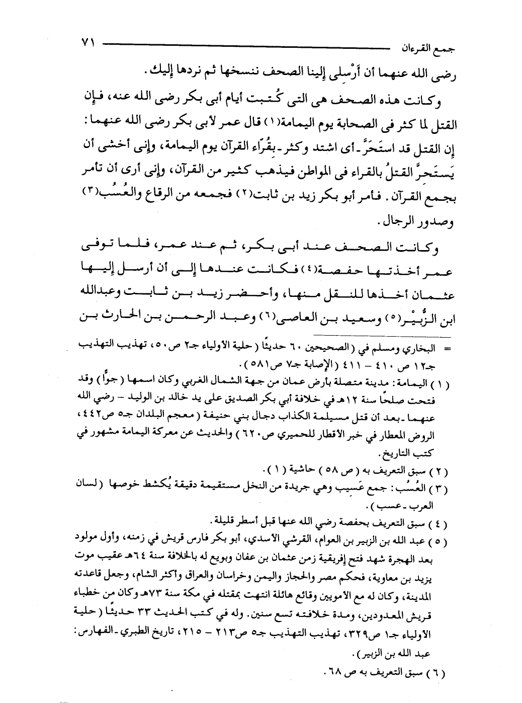 وكانت هذه الصحف هى التي كتبت أيام أبى بكر رضي الله عنه، فإِن القتل لما كثر في الصحابة يوم اليمامة (1) قال عمر لأبي بكر رضي الله عنهما: إِن القتل قد استَحَرَّ -أي اشتد وكثر- بِقُرّاء القرآن يوم اليمامة، وإنى أخشى أن يَستَحِرَّ القتل بالقراء في المواطن فيذهب كثير من القرآن، وإنى أرى أن تأمر بجمع القرآن. فأمر أبو بكر زيد بن ثابت (2) فجمعه من الرقاع والعُسُب (3) وصدور الرجال.