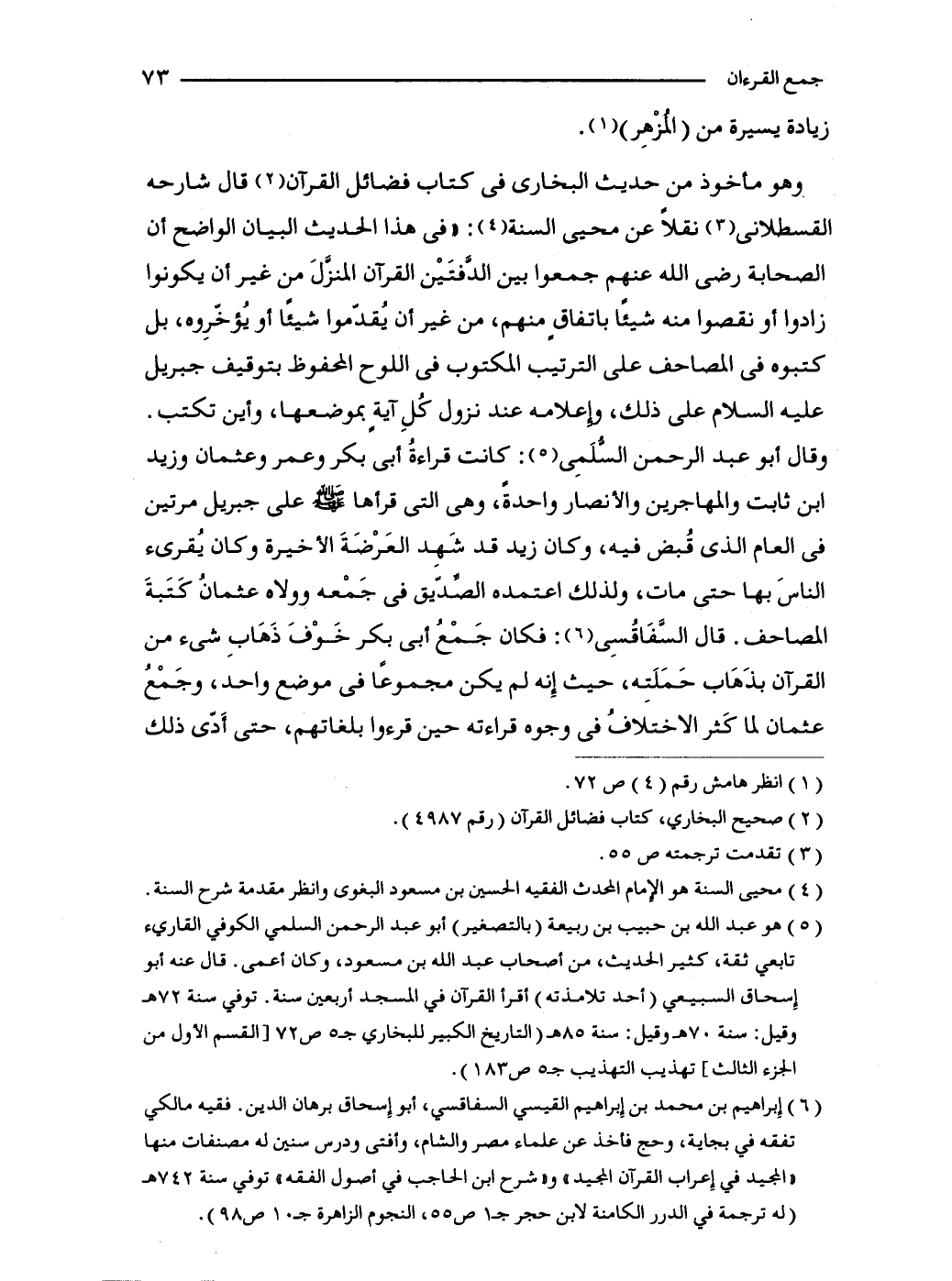 (5) هو عبد الله بن حبيب بن ربيعة (بالتصغير) أبو عبد الرحمن السلمي الكوفي القاريء تابعي ثقة، كثير الحديث، من أصحاب عبد الله بن مسعود، وكان أعمى. قال عنه أبو إِسحاق السبيعي (أحد تلامذته) أقرأ القرآن في المسجد أربعين سنة. توفي سنة 72 هـ وقيل: سنة 70 هـ وقيل: سنة 85 هـ (التاريخ الكبير للبخاري جـ5 ص 72 [القسم الأول من الجزء الثالث] تهذيب التهذيب جـ5 ص 183).