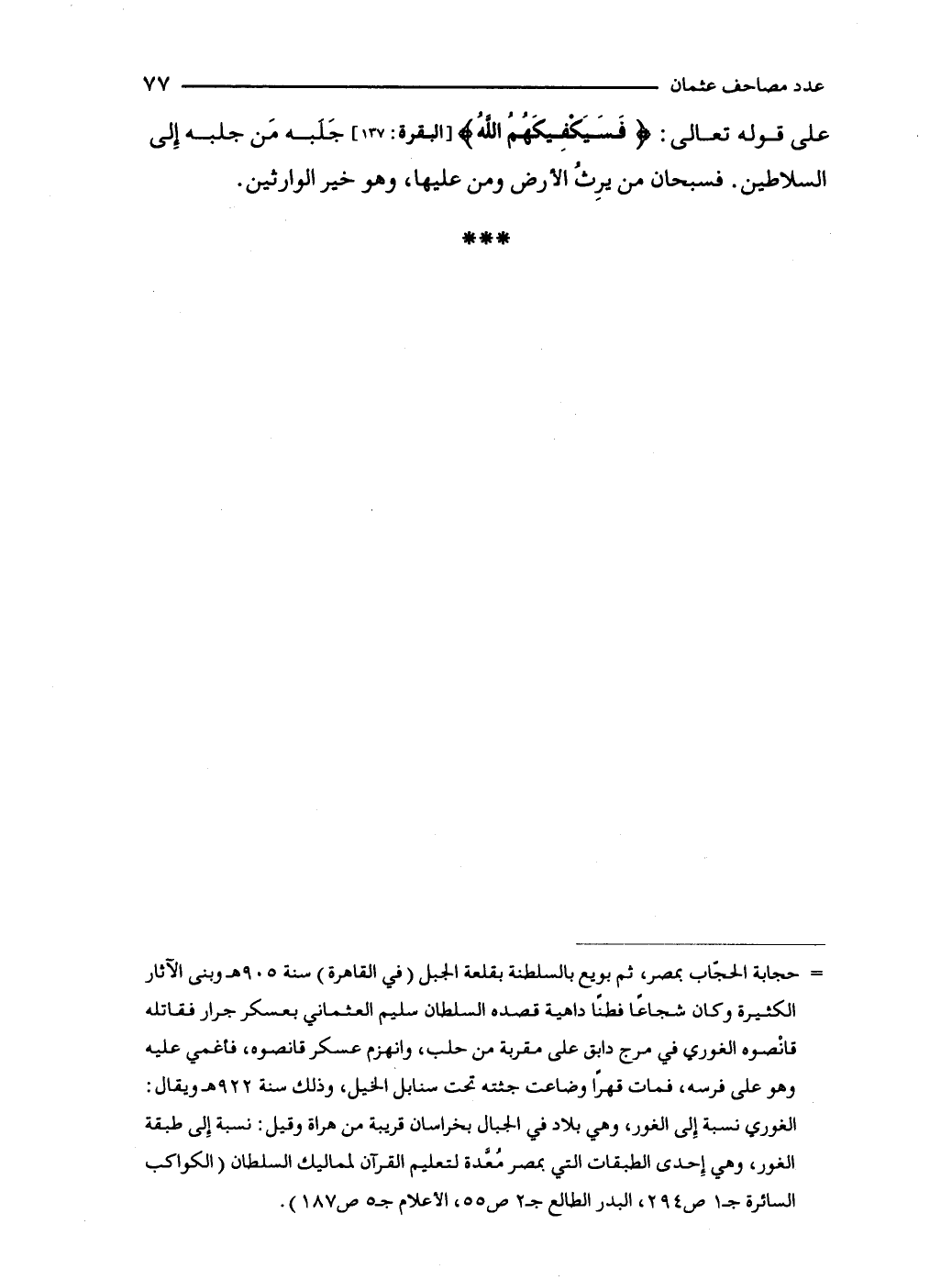 على قوله تعالى: {فَسَيَكْفِيكَهُمُ اللَّهُ} [البقرة: 137] جَلبه مَن جلبه إِلى السلاطين. فسبحان من يرِثُ الأرض ومن عليها، وهو خير الوارثين.