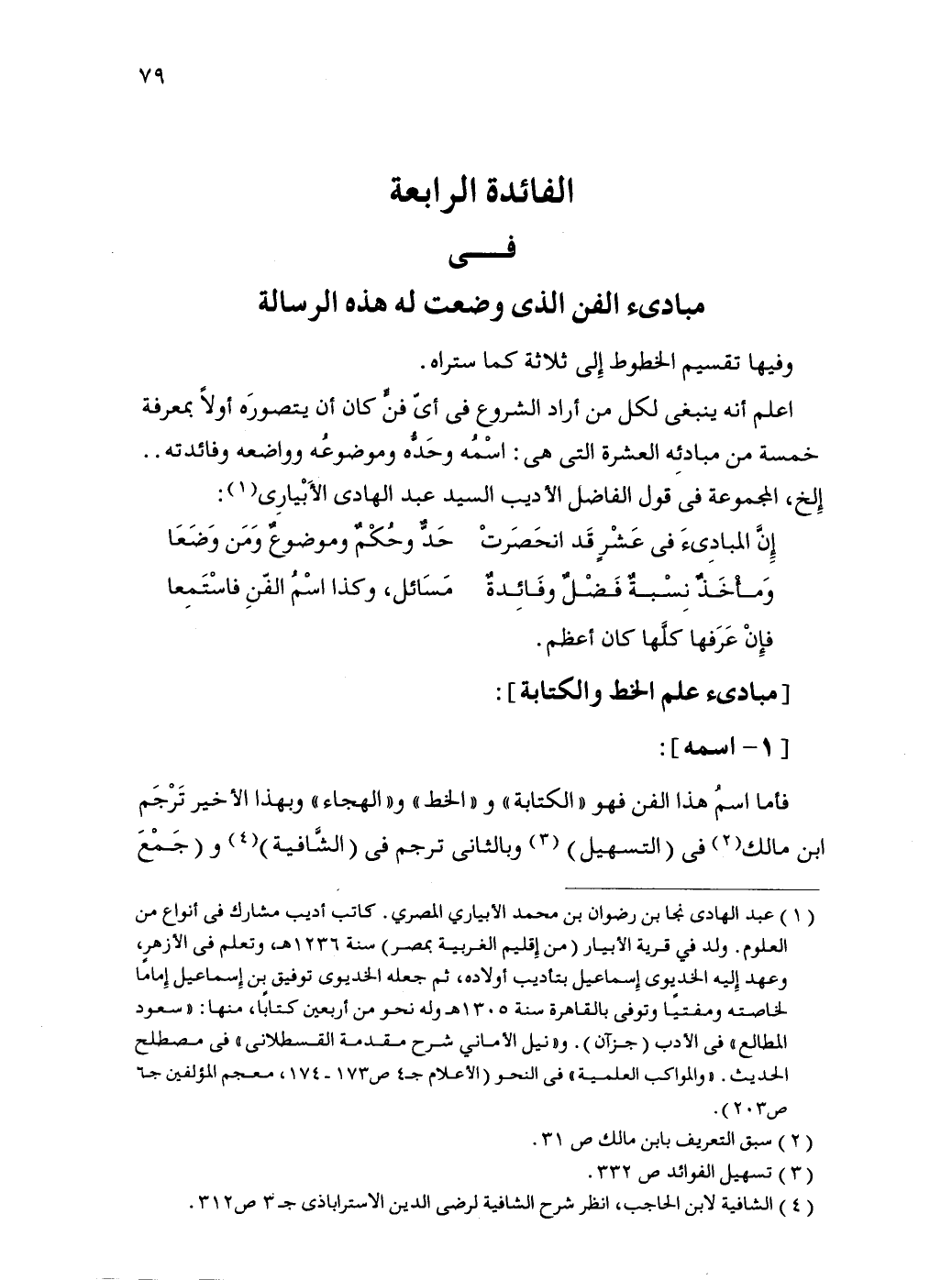 اعلم أنه ينبغى لكل من أراد الشروع في أىّ فنٍّ كان أن يتصورَه أولًا بمعرفة خمسة من مبادئهِ العشرة التي هى: اسْمُه وحَدُّة وموضوعُه وواضعه وفائدته .. إِلخ، المجموعة في قول الفاضل الأديب السيد عبد الهادى الأَبْيارِى (1):