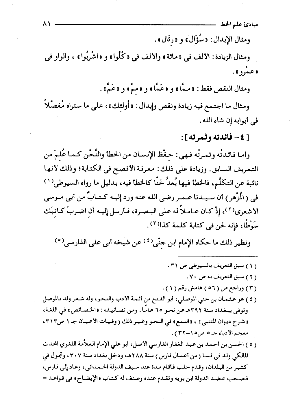 (4) هو عثمان بن جني الموصلي، أبو الفتح من أئمة الأدب والنحو، وله شعر ولد بالموصل وتوفى ببغداد سنة 392 هـ عن نحو 65 عامًا. ومن تصانيفه: "الخصائص" في اللغة، "شرح ديوان المتنبي"، "اللمع" في النحو وغير ذلك (وفيات الأعيان جـ1 ص 313، معجم الأدباء جـ5 ص 15 - 32).