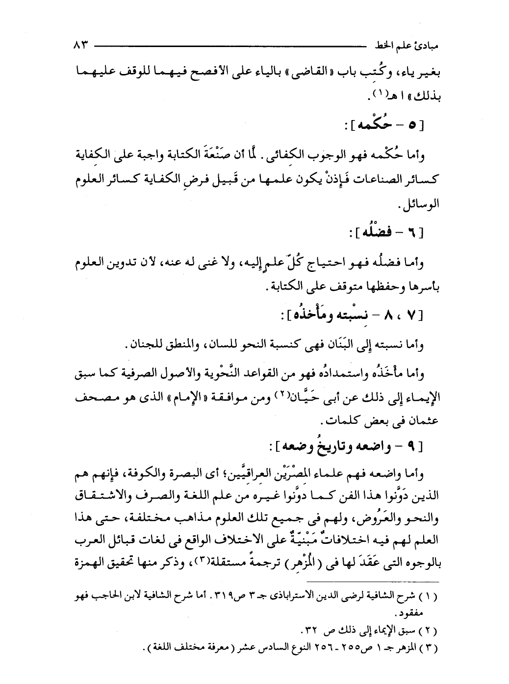 وأما حُكْمه فهو الوجوب الكِفائى. لمَّا أن صَنْعَةَ الكتابة واجبة على الكِفاية كسائر الصناعات فَإِذنْ يكون علمها من قَبيل فرضِ الكفاية كسائر العلوم الوسائل.