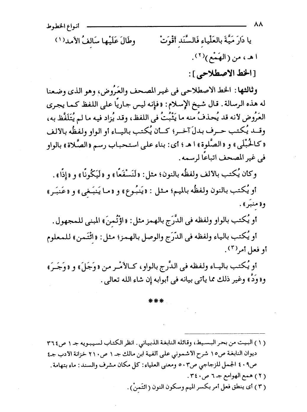 وثالثها: الخط الاصطلاحى في غير المصحف والعَرُوض، وهو الذي وضعنا له هذه الرسالة. قال شيخ الإسلام: "فإِنه ليس جاريًا على اللفظ كما يجرى العَرُوض لأنه قد يُحذفُ منه ما يَثْبُتُ في اللفظ، وقد يُزاد فيه ما لم يُتَلَفَّظ به، وقد يُكتب حرف بدلَ آخر؛ كأن يُكتب بالياء أو الواو ولفظُه بالألف "كالحُبْلَى" و"الصَّلوة" اهـ؛ أي: بناء على استحباب رسم "الصَّلاة" بالواو في غير المصحف اتباعًا لرسمه.