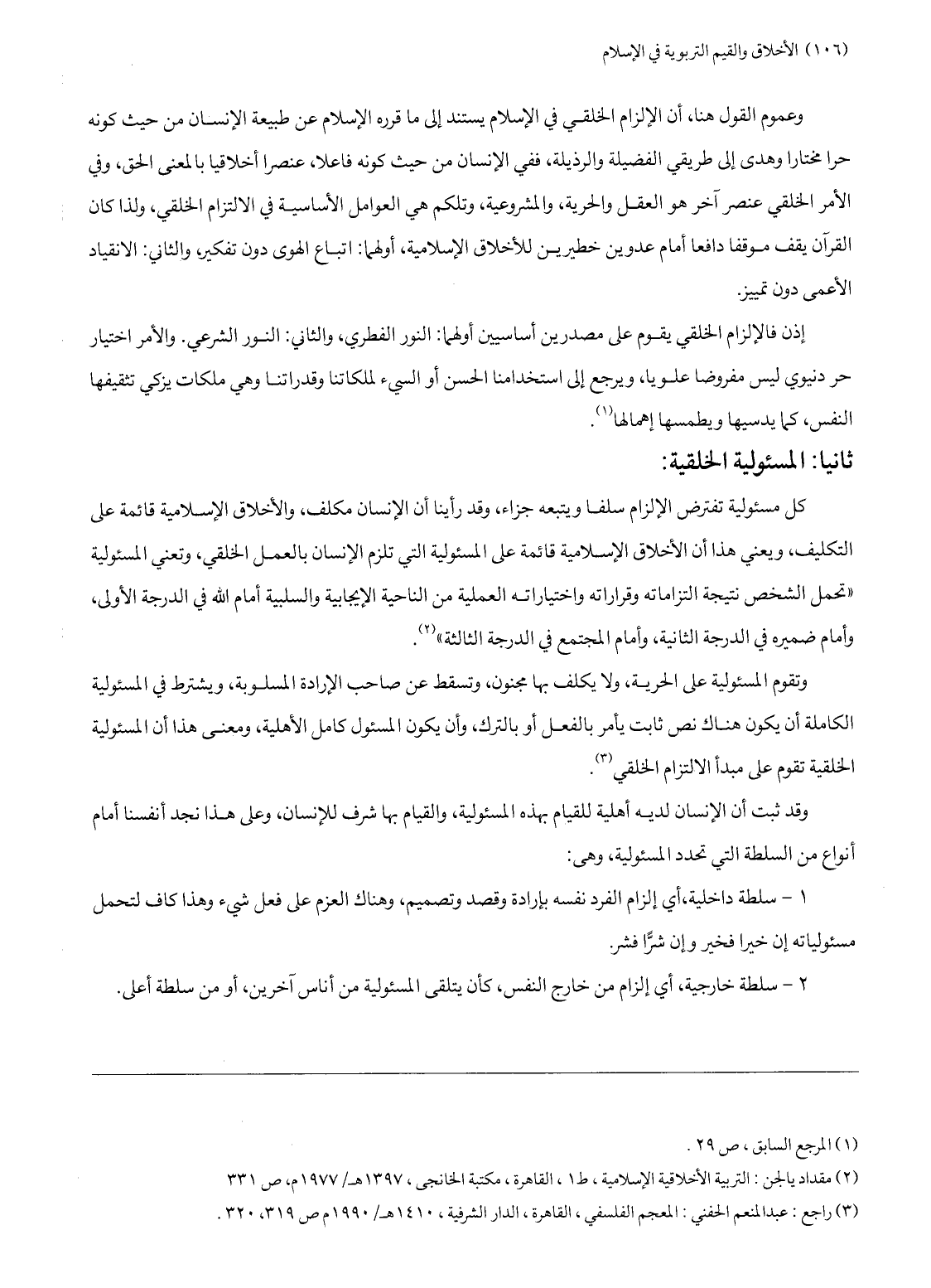 (2) مقداد يالجن: التربية الأخلاقية الإسلامية، ط 1، القاهرة، مكتبة الخانجى، 1397 هـ/ 1977 م، ص 331 (بتصرف) .