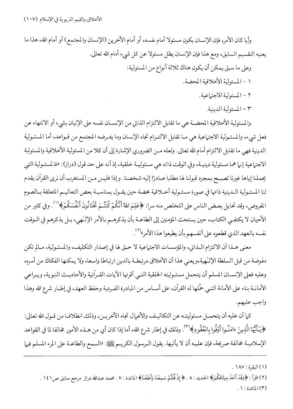 والمسئولية الأخلاقية المحضة هي ما تقابل الالتزام الذاتي من الإنسان نفسه على الإتيان بشيء أو الانتهاء عن فعل شيء، والمسئولية الاجتماعية هي ما تقابل الالتزام تجاه الإنسان وما يفرضه المجتمع من قواعد، أما المسئولية الدينية فهي ما تقابل الالتزام أمام الله تعالى. ولعله من الضروري الإشارة إلى أن كلا من المسئولية الأخلاقية والمسئولية الاجتماعية إنما هما مسئولية دينية، وفي الوقت ذاته هي مسئولية خلقية، إذ أنه على حد قول (دراز) : «فالمسئولية التي يحملنا إياها غيرنا تصبح بمجرد قبولنا لها مطلبا صادرا إليه شخصنا. وإذا فليس من المستغرب أن نرى القرآن يقدم لنا المسئولية الدينية ذاتها في صورة مسئولية أخلاقية محضة حين يقول بمناسبة بعض التعاليم المتعلقة بالصوم المفروض، وقد تحايل بعض الناس على التخلص منه سرا: عَلِمَ اللَّهُ أَنَّكُمْ كُنْتُمْ تَخْتانُونَ أَنْفُسَكُمْ «1» . وفي كثير من الأحيان لا يكتفي الكتاب، حين يستحث المؤمنين إلى الطاعة بأن يذكرهم بالأمر الإلهي، بل يذكرهم في الوقت نفسه بالعهد الذي قطعوه على أنفسهم بأن يطيعوا هذا الأمر» «2» .