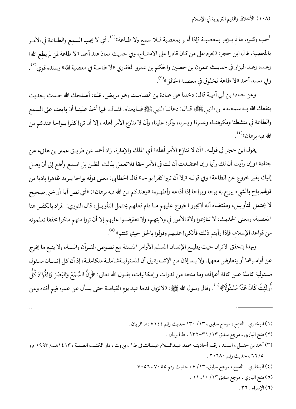 وبهذا يتحقق الاتزان حيث يطيع الإنسان المسلم الأوامر المتسقة مع نصوص القرآن والسنة، ولا يتبع ما يخرج عن أوامرهما أو يتعارض معهما. ولا بد إذن من الإشارة إلى أن المسئولية شاملة متكاملة، إذ أن كل إنسان مسئول مسئولية كاملة عن كافة أعماله، وما منحه من قدرات وإمكانيات، يقول الله تعالى: إِنَّ السَّمْعَ وَالْبَصَرَ وَالْفُؤادَ كُلُّ أُولئِكَ كانَ عَنْهُ مَسْؤُلًا «6» . وقال رسول الله صلّى الله عليه وسلّم: «لا تزول قدما عبد يوم القيامة حتى يسأل عن عمره