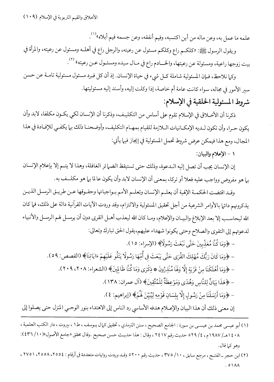 ذكرنا أن الأخلاق في الإسلام تقوم على أساس من التكليف، وذكرنا أن الإنسان لكي يكون مكلفا، لابد وأن يكون حرا، وأن تكون لديه الإمكانيات اللازمة للقيام بمهام التكليف، وأوضحنا ذلك بما يكفي للإفادة في هذا المجال، ومع هذا فيمكن عرض شروط تحمل المسئولية في إيجاز فيما يأتي: