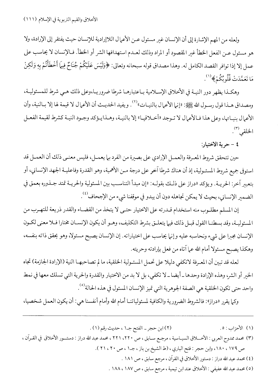 (3) محمد ممدوح العربي: الأخلاق السياسية، مرجع سابق، ص 220، 221، محمد عبد الله دراز: دستور الأخلاق فى القرآن، ص 179، 180، وابن حجر: فتح البارى، (ط الشيخ بن باز، ج 1، ص 20، 21) .
