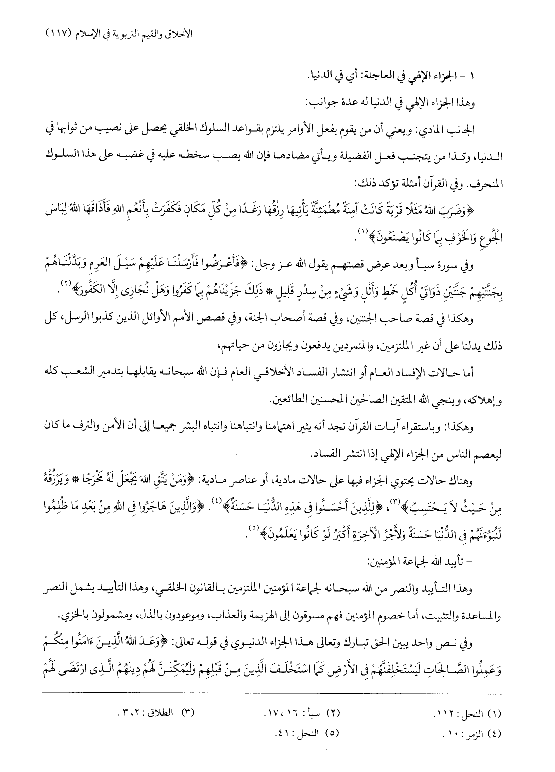 وهناك حالات يحتوي الجزاء فيها على حالات مادية، أو عناصر مادية: وَمَنْ يَتَّقِ اللَّهَ يَجْعَلْ لَهُ مَخْرَجاً* وَيَرْزُقْهُ مِنْ حَيْثُ لا يَحْتَسِبُ «3» ، لِلَّذِينَ أَحْسَنُوا فِي هذِهِ الدُّنْيا حَسَنَةٌ «4» . وَالَّذِينَ هاجَرُوا فِي اللَّهِ مِنْ بَعْدِ ما ظُلِمُوا لَنُبَوِّئَنَّهُمْ فِي الدُّنْيا حَسَنَةً وَلَأَجْرُ الْآخِرَةِ أَكْبَرُ لَوْ كانُوا يَعْلَمُونَ «5» .