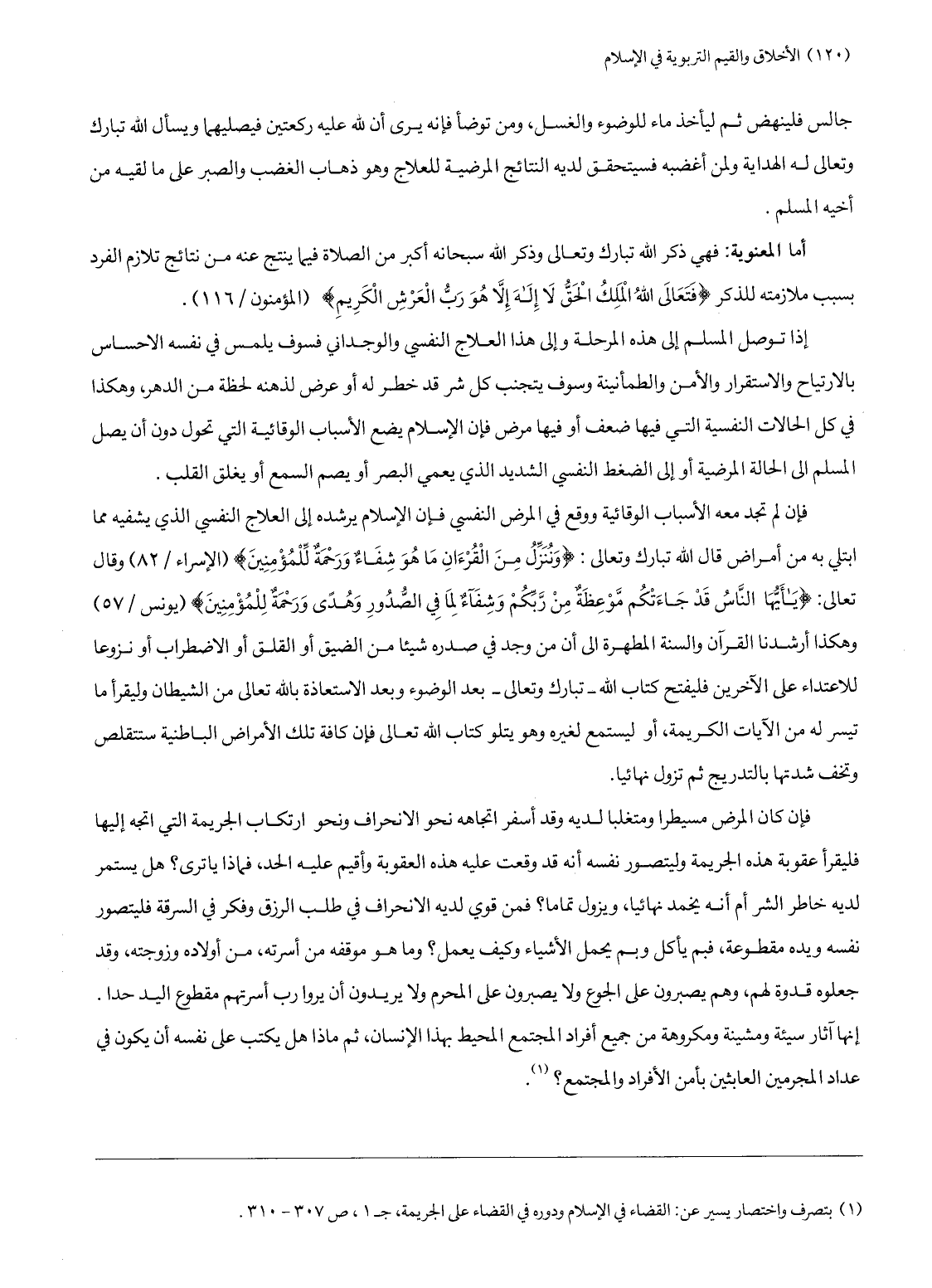 فإن لم تجد معه الأسباب الوقائية ووقع في المرض النفسي فإن الإسلام يرشده إلى العلاج النفسي الذي يشفيه مما ابتلي به من أمراض قال الله تبارك وتعالى: وَنُنَزِّلُ مِنَ الْقُرْآنِ ما هُوَ شِفاءٌ وَرَحْمَةٌ لِلْمُؤْمِنِينَ (الإسراء/ 82) وقال تعالى: يا أَيُّهَا النَّاسُ قَدْ جاءَتْكُمْ مَوْعِظَةٌ مِنْ رَبِّكُمْ وَشِفاءٌ لِما فِي الصُّدُورِ وَهُدىً وَرَحْمَةٌ لِلْمُؤْمِنِينَ (يونس/ 57) وهكذا أرشدنا القرآن والسنة المطهرة إلى أن من وجد في صدره شيئا من الضيق أو القلق أو الاضطراب أو نزوعا للاعتداء على الآخرين فليفتح كتاب الله- تبارك وتعالى- بعد الوضوء وبعد الاستعاذة بالله تعالى من الشيطان وليقرأ ما تيسر له من الآيات الكريمة، أو ليستمع لغيره وهو يتلو كتاب الله تعالى فإن كافة تلك الأمراض الباطنية ستتقلص وتخف شدتها بالتدريج ثم تزول نهائيا.