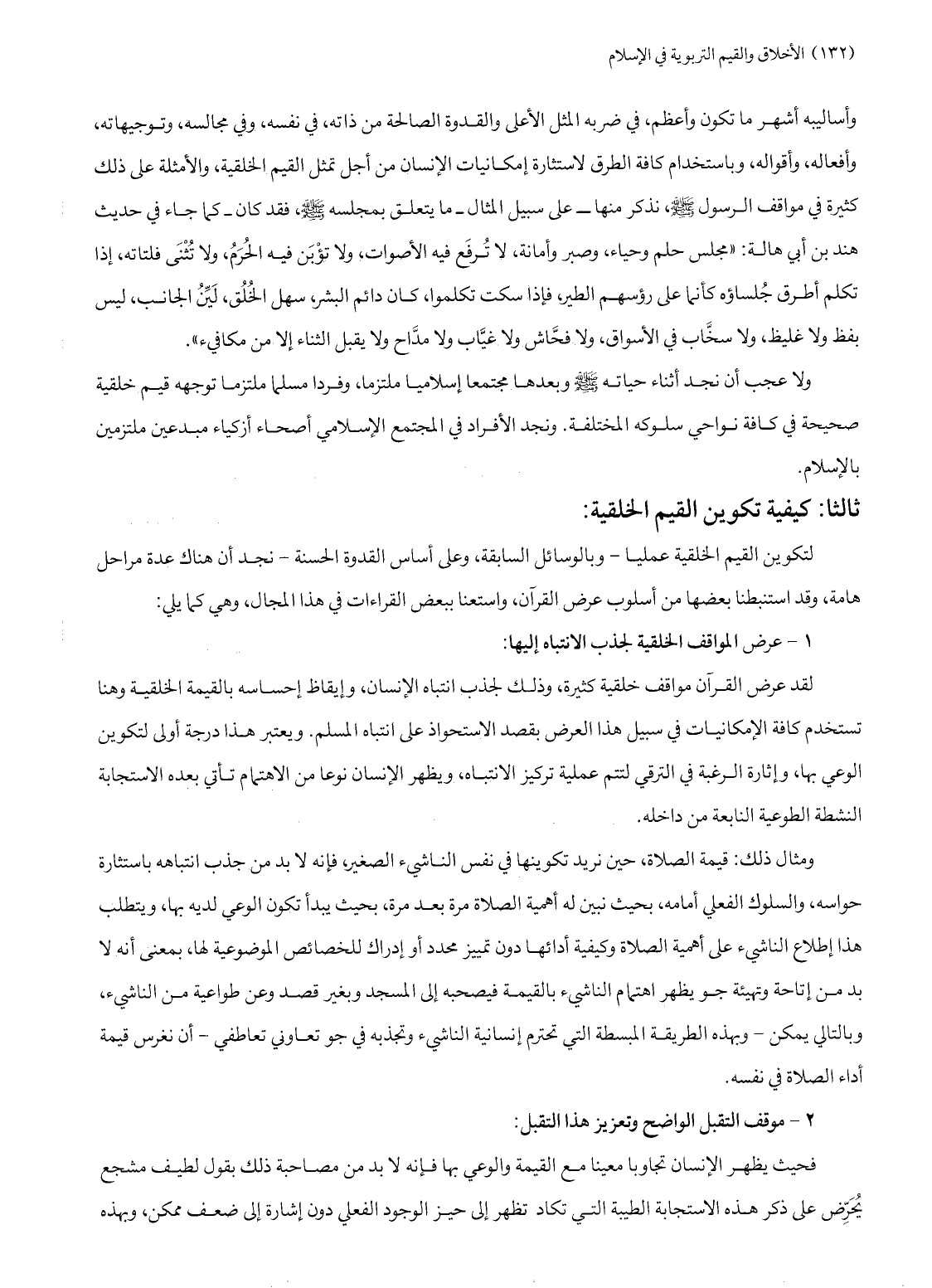 وتوجيهاته، وأفعاله، وأقواله، وباستخدام كافة الطرق لاستثارة إمكانيات الإنسان من أجل تمثل القيم الخلقية، والأمثلة على ذلك كثيرة في مواقف الرسول صلّى الله عليه وسلّم، نذكر منها- على سبيل المثال- ما يتعلق بمجلسه صلّى الله عليه وسلّم، فقد كان- كما جاء في حديث هند بن أبي هالة: «مجلس حلم وحياء، وصبر وأمانة، لا ترفع فيه الأصوات، ولا تؤبّن فيه الحرم، ولا تثنى فلتاته، إذا تكلم أطرق جلساؤه كأنما على رءوسهم الطير، فإذا سكت تكلموا، كان دائم البشر، سهل الخلق، ليّن الجانب، ليس بفظ ولا غليظ، ولا سخّاب في الأسواق، ولا فحّاش ولا عيّاب ولا مدّاح ولا يقبل الثناء إلا من مكافيء» .