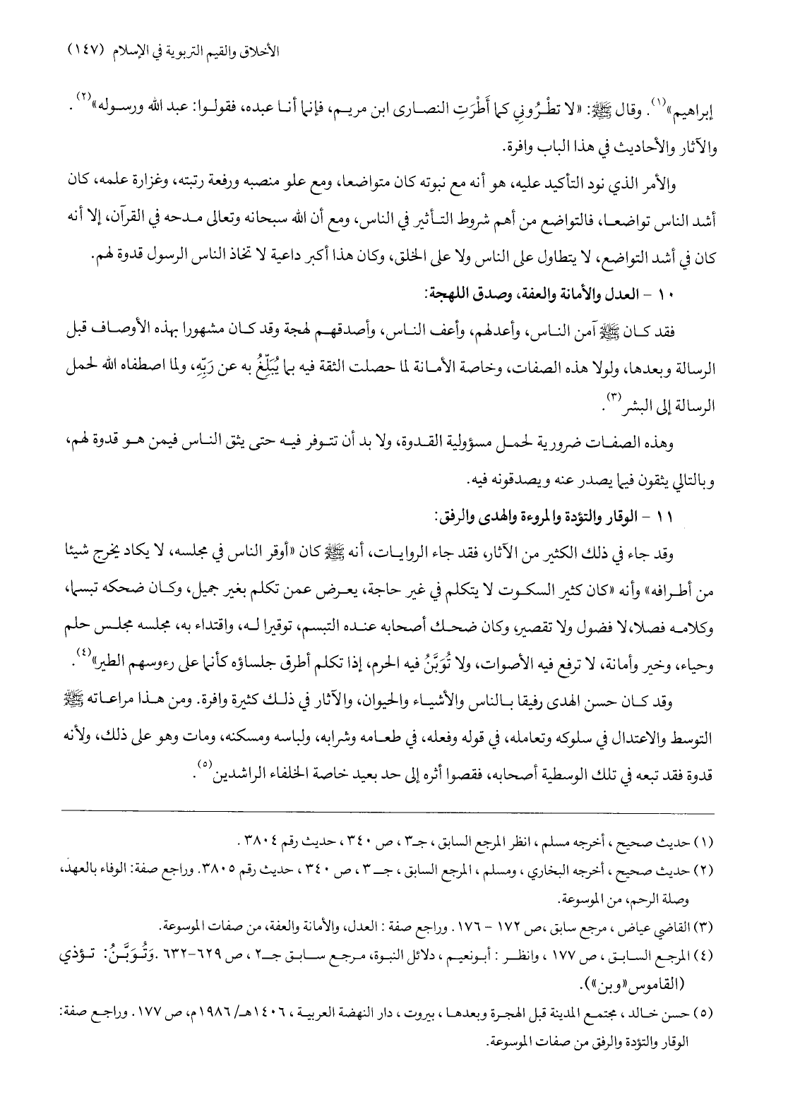 (5) حسن خالد، مجتمع المدينة قبل الهجرة وبعدها، بيروت، دار النهضة العربية، 1406 هـ/ 1986 م، ص 177. وراجع صفة: الوقار والتؤدة والرفق من صفات الموسوعة.