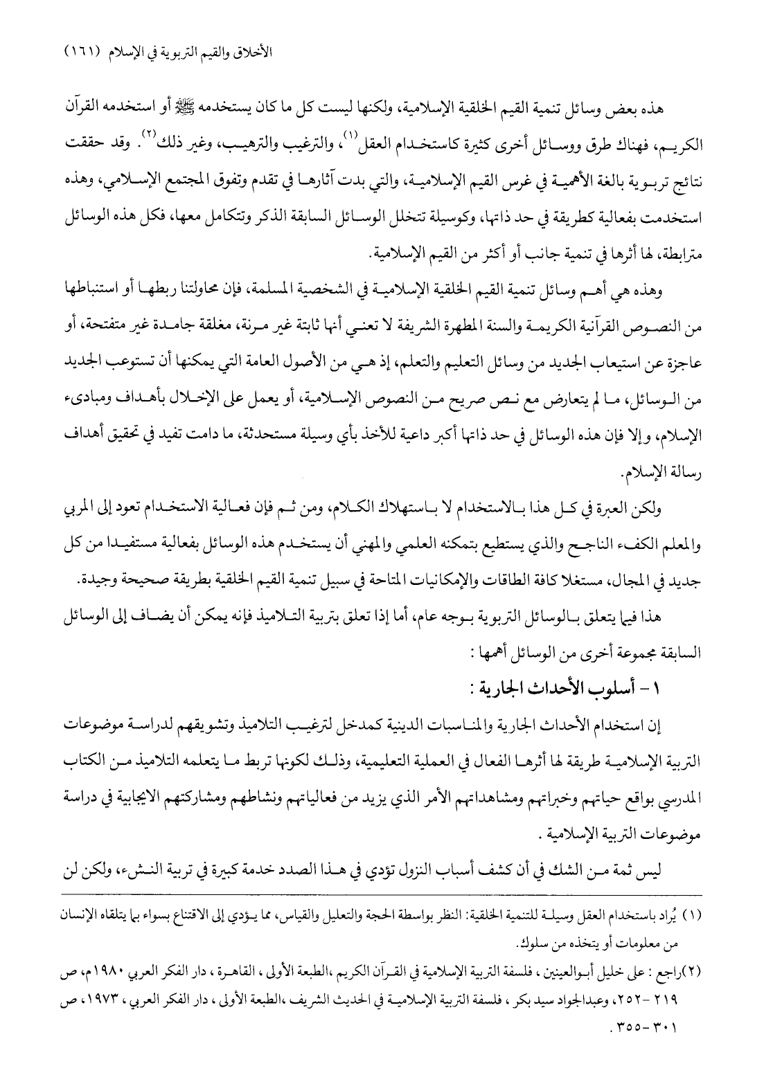 (2) راجع: على خليل أبو العينين، فلسفة التربية الإسلامية في القرآن الكريم، الطبعة الأولى، القاهرة، دار الفكر العربي 1980 م، ص 219- 252، وعبد الجواد سيد بكر، فلسفة التربية الإسلامية في الحديث الشريف، الطبعة الأولى، دار الفكر العربي، 1973، ص 301- 355.