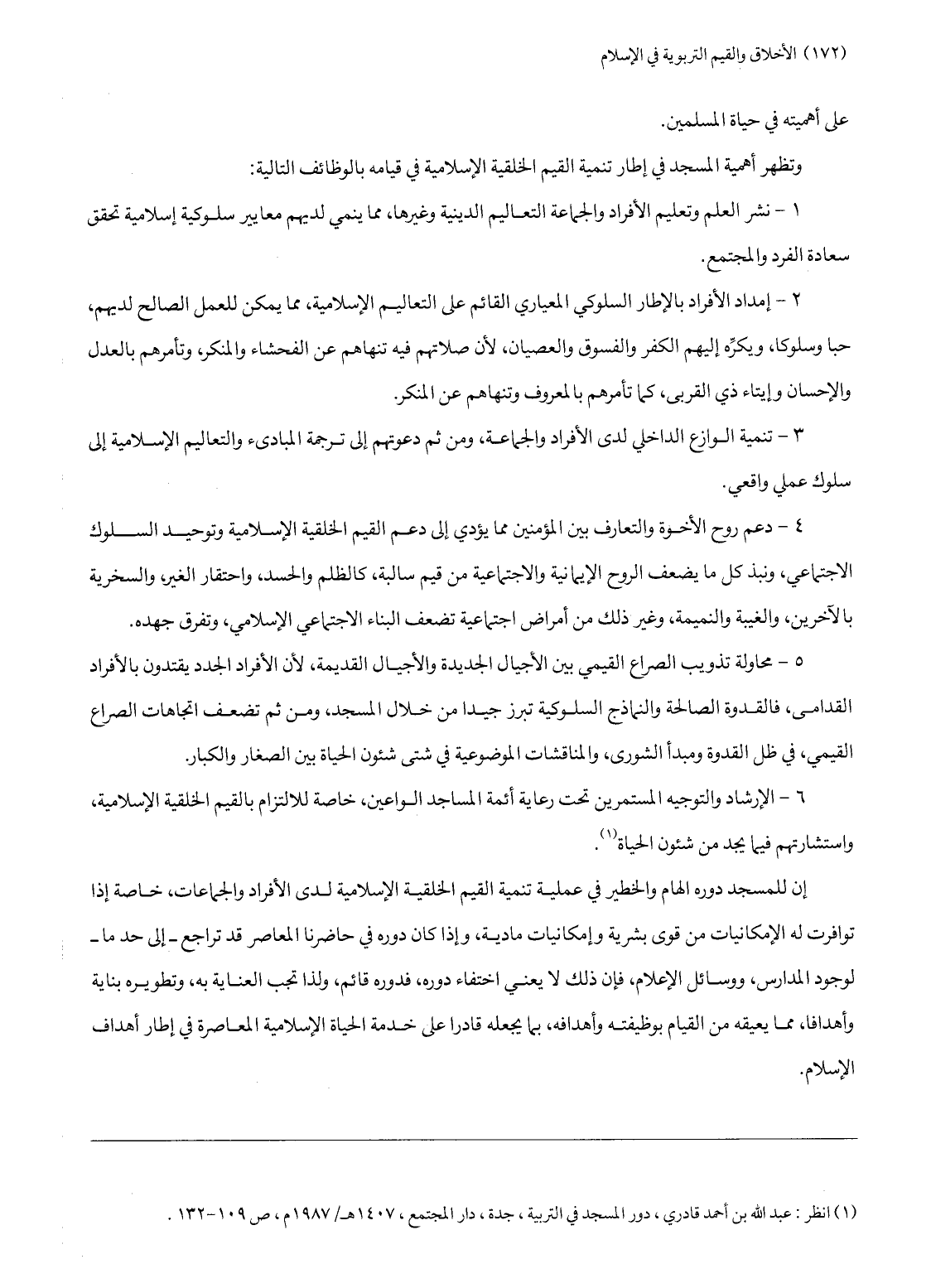 (1) انظر: عبد الله بن أحمد قادري، دور المسجد في التربية، جدة، دار المجتمع، 1407 هـ/ 1987 م، ص 109- 132.