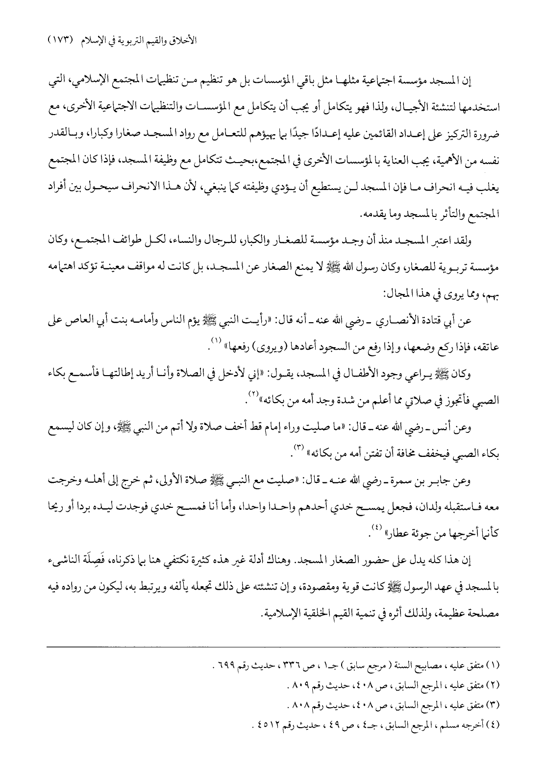إن هذا كله يدل على حضور الصغار المسجد. وهناك أدلة غير هذه كثيرة نكتفي هنا بما ذكرناه، فصلة الناشىء بالمسجد في عهد الرسول صلّى الله عليه وسلّم كانت قوية ومقصودة، وإن تنشئته على ذلك تجعله يألفه ويرتبط به، ليكون من رواده فيه مصلحة عظيمة، ولذلك أثره في تنمية القيم الخلقية الإسلامية.