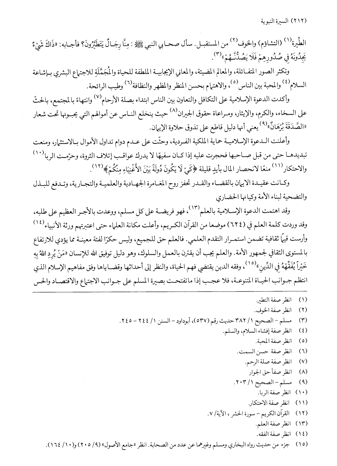وقد اهتمت الدعوة الإسلامية بالعلم «13» ، فهو فريضة على كل مسلم، ووعدت بالأجر العظيم على طلبه، وقد وردت كلمة العلم في (624) موضعا من القرآن الكريم، وأعلت مكانة العلماء حتى اعتبرتهم ورثة الأنبياء «14» وأرست قيما ثقافية تضمن استمرار التقدم العلمي. فالعلم حق للجميع، وليس حكرا لفئة معينة مما يؤدي للارتفاع بالمستوى الثقافي لجمهور الأمة. والعلم يجب أن يقترن بالعمل والسلوك، وهو دليل توفيق الله للإنسان «من يرد الله به خيرا يفقّهه في الدّين» «15» ، وفقه الدين يقتضي فهم الحياة، والنظر إلى أحداثها وقضاياها وفق مفاهيم الإسلام الذي انتظم جوانب الحياة المتنوعة، فلا عجب إذا ما تفتحت بصيرة المسلم على جوانب الاجتماع والاقتصاد والحس والذوق وقيم الجمال بصورة أرحب وأعمق وأشمل كلما ازداد بصيرة في دينه.