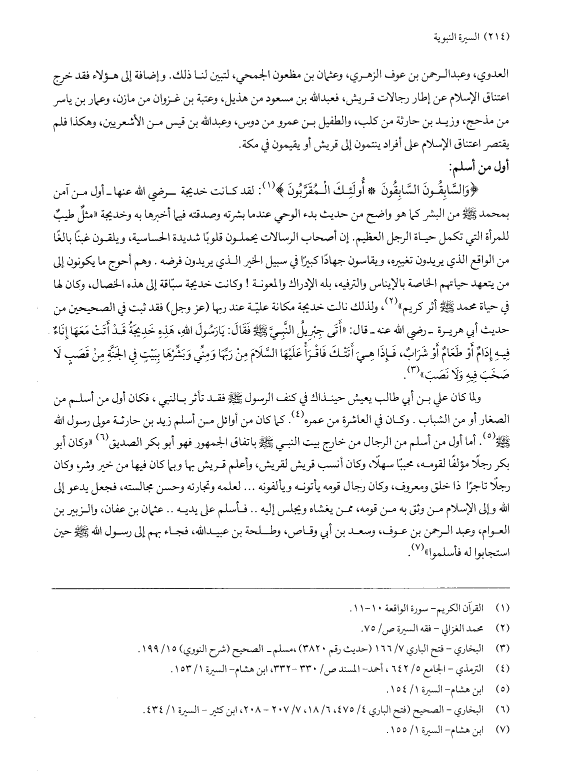 وَالسَّابِقُونَ السَّابِقُونَ* أُولئِكَ الْمُقَرَّبُونَ «1» : لقد كانت خديجة- رضي الله عنها- أول من آمن بمحمد صلّى الله عليه وسلّم من البشر كما هو واضح من حديث بدء الوحي عند ما بشرته وصدقته فيما أخبرها به وخديجة «مثل طيب للمرأة التي تكمل حياة الرجل العظيم. إن أصحاب الرسالات يحملون قلوبا شديدة الحساسية، ويلقون غبنا بالغا من الواقع الذي يريدون تغييره، ويقاسون جهادا كبيرا في سبيل الخير الذي يريدون فرضه. وهم أحوج ما يكونون إلى من يتعهد حياتهم الخاصة بالإيناس والترفيه، بله الإدراك والمعونة! وكانت خديجة سبّاقة إلى هذه الخصال، وكان لها في حياة محمد صلّى الله عليه وسلّم أثر كريم» «2» ، ولذلك نالت خديجة مكانة عليّة عند ربها (عز وجل) فقد ثبت في الصحيحين من حديث أبي هريرة- رضي الله عنه- قال: «أتى جبريل النّبيّ صلّى الله عليه وسلّم فقال: يا رسول الله، هذه خديجة قد أتت معها إناء فيه إدام أو طعام أو شراب، فإذا هي أتتك فاقرأ عليها السّلام من ربّها ومنّي وبشّرها ببيت في الجنّة من قصب لا صخب فيه ولا نصب» «3» .