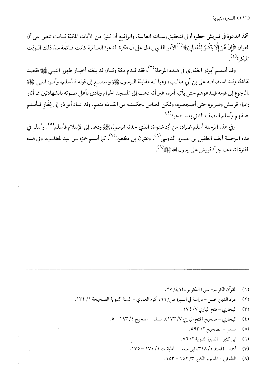 وأسلم في هذه المرحلة أيضا الطفيل بن عمرو الدوسي «6» . وعثمان بن مظعون «7» ، كما أسلم حمزة بن عبد المطلب، وفي هذه الفترة اشتدت جرأة قريش على رسول الله صلّى الله عليه وسلّم «8» .