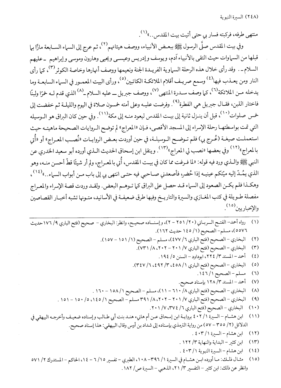 وفي بيت المقدس صلّى الرسول صلّى الله عليه وسلّم ببعض الأنبياء، ووصف هيئاتهم «2» ، ثم عرج إلى السماء السابعة مارّا بما قبلها من السماوات حيث التقى بالأنبياء آدم، ويوسف وإدريس وعيسى ويحيى وهارون وموسى وإبراهيم- عليهم السلام-. وقد رأى خلال هذه الرحلة السماوية الفريدة الجنة ونعيمها ووصف أنهارها وخاصة الكوثر «3» ، كما رأى النار ومن يعذب فيها «4» وسمع صريف أقلام الملائكة الكاتبين «5» ، ورأى البيت المعمور في السماء السابعة وما يدخله من الملائكة «6» ، كما وصف سدرة المنتهى «7» ، ووصف جبريل- عليه السلام- «8» الذي قدم له خمرا ولبنا فاختار اللبن، فقال جبريل هي الفطرة «9» . وفرضت عليه وعلى أمته خمسون صلاة في اليوم والليلة ثم خفضت إلى خمس صلوات «10» ، قبل أن ينزل ثانية إلى بيت المقدس ليعود منه إلى مكة «11» . وفي حين كان البراق هو الوسيلة التي تمت بواسطتها رحلة الإسراء إلى المسجد الأقصى، فإن «المعراج» لم توضح الروايات الصحيحة ماهيته حيث استعملت صيغة (عرج بي) فلم توضح الوسيلة، في حين أوردت بعض الروايات «نصب المعراج» أو «أتي بالمعراج» «12» وفي بعضها «نصب لي المعراج» «13» . وينقل ابن إسحاق الحديث الذي أورده أبو سعيد الخدري عن النبي صلّى الله عليه وسلّم والذي ورد فيه قوله: «لما فرغت مما كان في بيت المقدس، أتي بالمعراج، ولم أر شيئا قطّ أحسن منه، وهو الذي يمدّ إليه ميّتكم عينيه إذا حضر، فأصعدني صاحبي فيه حتى انتهى بي إلى باب من أبواب السماء..» «14» ، وهكذا فلم يكن الصعود إلى السماء قد حصل على البراق كما توهم البعض. ولقد وردت قصة الإسراء والمعراج مفصلة طويلة في كتب المغازي والسيرة والتاريخ وفيها طرق ضعيفة في الأسانيد، متونها تشبه أخبار القصاصين والإخباريين «15» .